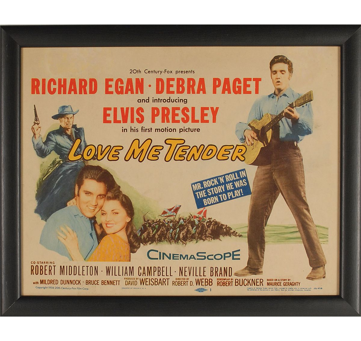 Original color 14 x 11 lobby card for Love Me Tender, featuring a full-length image of Elvis. Framed to an overall size of 15.5 x 12.5. In very good condition, with scattered light soiling and creasing, and some restoration to upper left border.