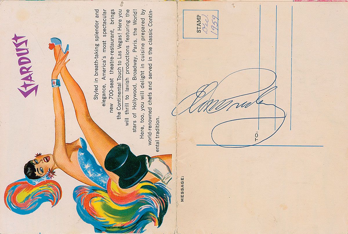 Vintage two-page program for the 3rd edition of the Lido de Paris show at the Stardust Hotel in Las Vegas, 6 x 9, two pages, signed in blue ballpoint on the outside lined address panel, “Elvis Presley.” Central vertical fold touching first letter of signature, some light creasing and toning, an ink notation in the stamp area and a couple tack holes to top edge, otherwise fine condition.