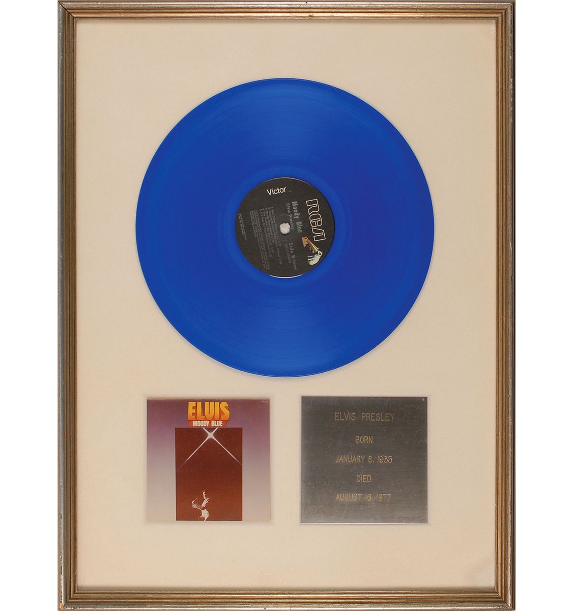 A display of Presley’s blue vinyl Moody Blue, Presley’s final studio album. Display features the album, an image of the cover art, and a small plaque with Presely’s birth and death dates. All are framed to an overall size of 18 x 24.5. In fine condition.