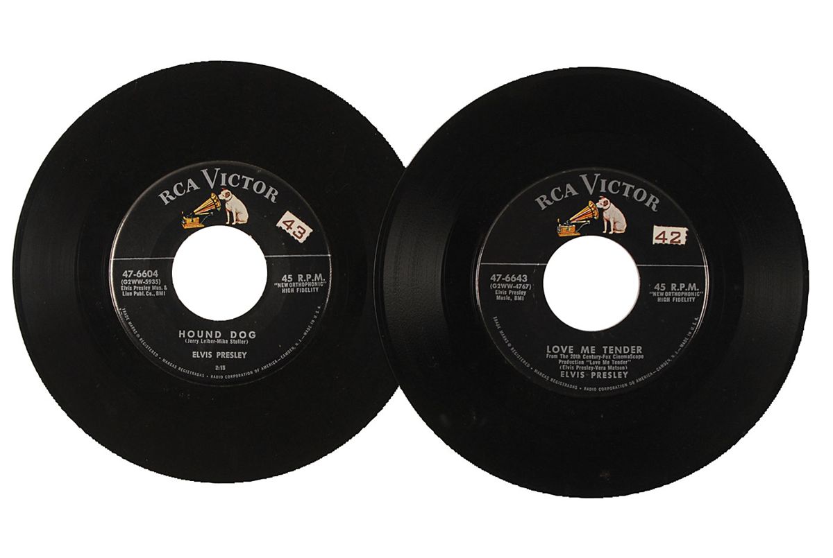 Two original 45 rpm Elvis Presley singles: Hound Dog/Don’t Be Cruel, RCA Victor RCA Victor 47-6604; and Love Me Tender/Anyway You Want Me, RCA Victor 47-6643. In fine condition. The sleeves are not included.