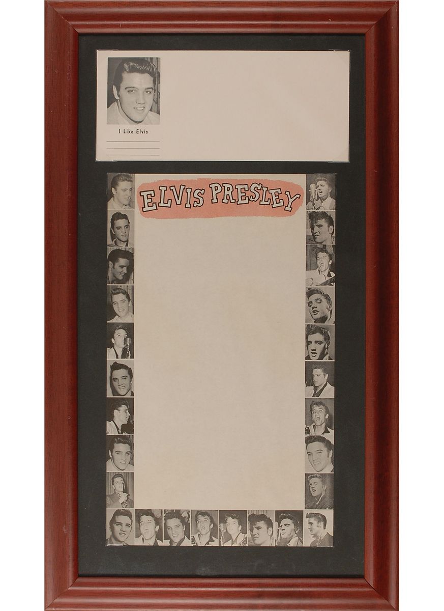 Extremely rare sheet of Elvis stationery, 8.5 x 14, from 1956; and a mailing envelope, 9.5 x 4, with Presley’s image on the left side above the return address area. Both are framed together to an overall size of 13.5 x 23.25. In fine condition. A miniscule number of these stationery sheets and envelopes have survived the 55 years since they were marketed for a very short time period, presumably at concert venues in 1956. This particular stationery is nowhere to be found among the many Elvis Presley Enterprises (EPE) licensed products advertised during 1956 or beyond.