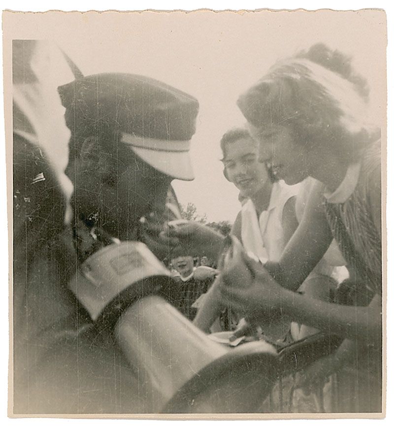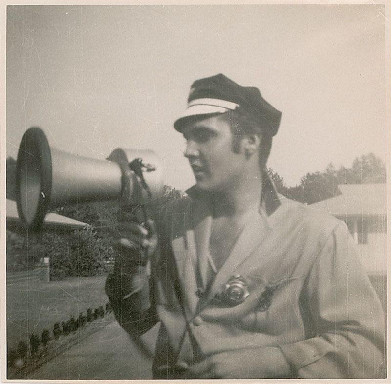 Color satin-finish 4.25 x 3 candid photo of a woman standing out in front of Presley’s home at 1034 Audubon Drive in Memphis, signed on the reverse in blue ballpoint. Reverse also bears a partial date notation of the 1950s in an unknown hand. In fine condition, with lightly trimmed edges, and surface impression to image from Presley’s signature. Accompanied by two other candid glossy photos, both approximately 3 x 3, one of Elvis in front of his home, dressed in a policeman’s hat and badge and holding up a megaphone, with female fans mobbing the singer in one photo. Presley used the royalties he earned from ‘Heartbreak Hotel,’ to purchase the home on Audubon Drive. Most likely a never-before-seen trio of unpublished photos showing Elvis’s lighter side and interaction with the fans who would make him a legend.
