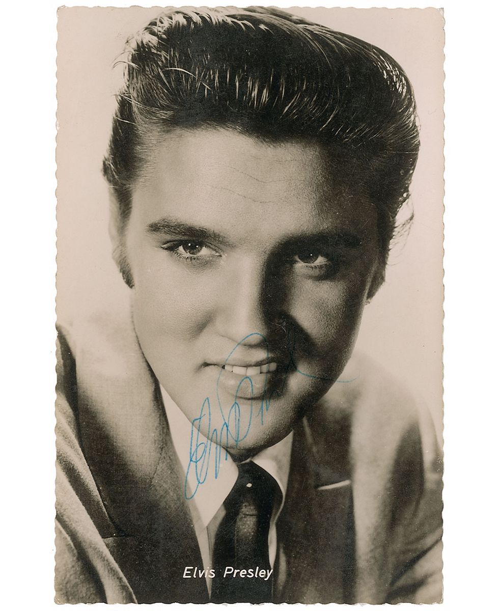 Handsome vintage 3.5 x 5.5 German postcard photo of Presley in a suit and tie, signed in blue ballpoint. In fine condition, with some light contrast to the end of the signature. Postcard was published by Kolibri-Verlag G.m.b.H., Minden/Westfalen, Germany, and is marked number 304 in the stamp area. A rarely seen image in terrific condition.