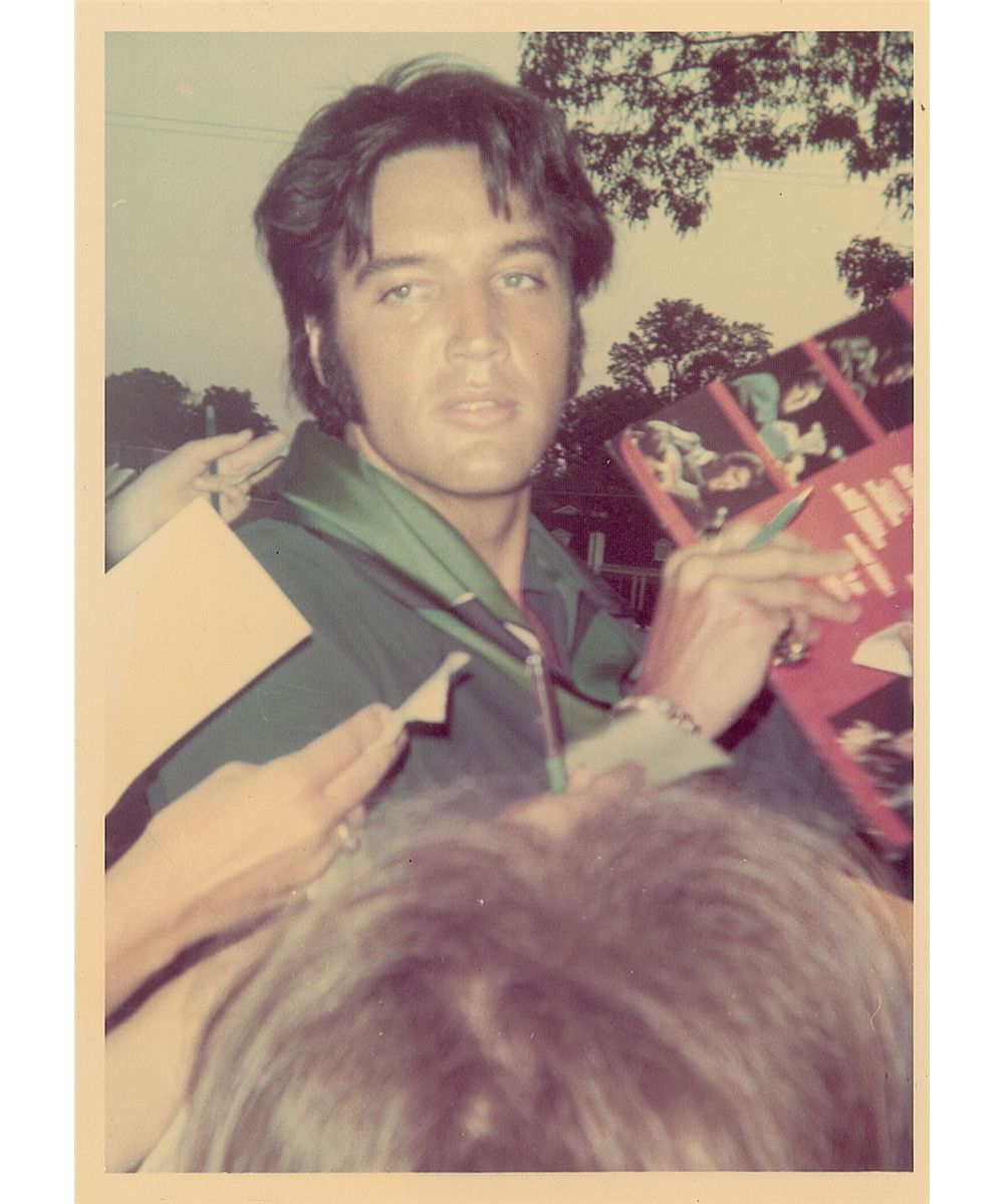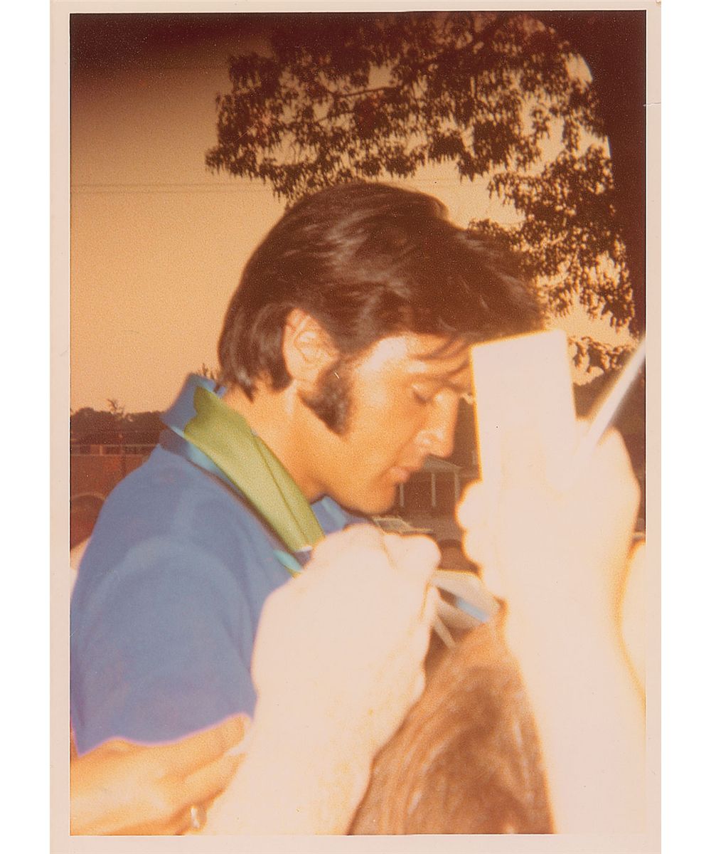 Vintage ballpoint signature, “Elvis Presley,” on the reverse of a clipped 3 x 3.5 magazine or catalog page. In very good condition, with intersecting folds, several passing through signature, and some light wrinkling. Accompanied by two original unsigned vintage color satin-finish 5 x 7 photos of Presley being mobbed for his autograph outside, both dated on the reverse 1969.
