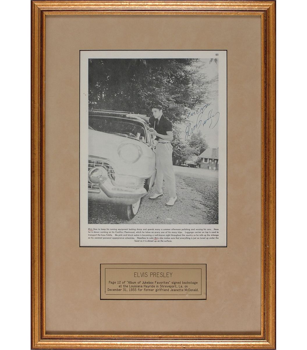 Vintage program page from Presley’s 1956 Album of Jukebox Favorites, 8.25 x 11, showing Presley waxing his pink Cadillac Fleetwood, signed in blue ballpoint, “Love you, Elvis Presley.” Suede matted and framed with a plaque stating that the page was signed backstage at the Louisiana Hayride in Shreveport, Louisiana, on December 31, 1955, for his former girlfriend, Jeanette McDonald. In fine condition. Originally purchased as a replacement for his first Cadillac which burned on the side of the road, this model was purchased in the summer of 1955, and was given to his mother as a gift. As Gladys Presley never got her driver’s license, Elvis and his band used the car to travel to shows.
