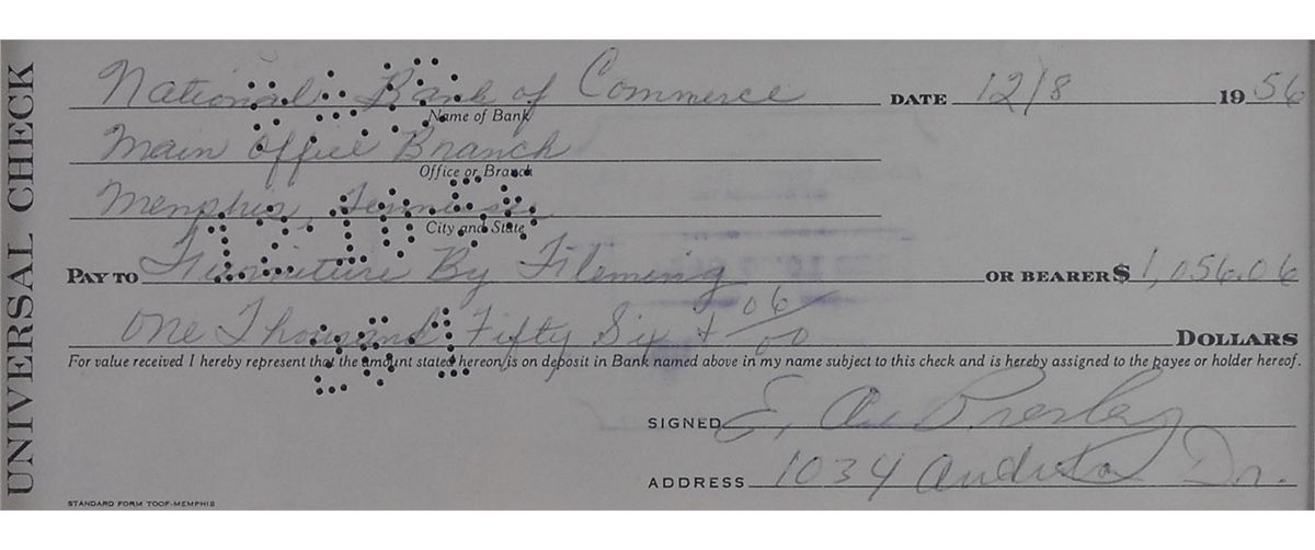 Universal check, 7.5 x 3, filled out and signed by Presley, “E. A. Presley,” payable to Furniture by Fleming for $1056.06, December 8, 1956. Elvis also adds the bank name and address to the top, “National Bank of Commerce, Main Office Branch, Memphis, Tennessee.” Double-matted and shadow-boxed and framed with a color photo of Elvis, a Mattel Elvis doll in its original packaging, and a ticket for his June 18, 1977, performance in Kansas City, Missouri, to an overall size of 26.75 x 23.5. In fine condition, with cancellation holes to left side and light show-through from a stamp on reverse. Just three months after purchasing furniture, Presley plunked down a $1000 cash deposit on Graceland on March 19, 1957. The year of 1956 began Presley’s commercial breakthrough as he appeared on multiple television shows, starred in his first movie, released several of his classic hits, and enjoyed an unprecedented windfall of millions of dollars from his records and merchandising. Presley checks from this early in his career are very rare.
