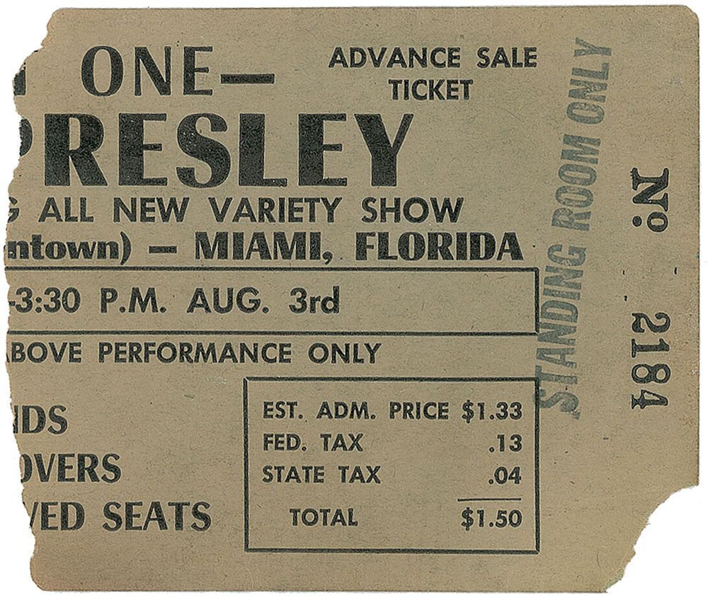 Partial original ticket for an Elvis Presley appearance on August 3, 1956, in Miami, Florida. Ticket measures 3.5 x 3 and is stamped on both sides “Standing Room Only.” In very good condition, with rough left edge, missing lower right corner tip, and light handling wear.