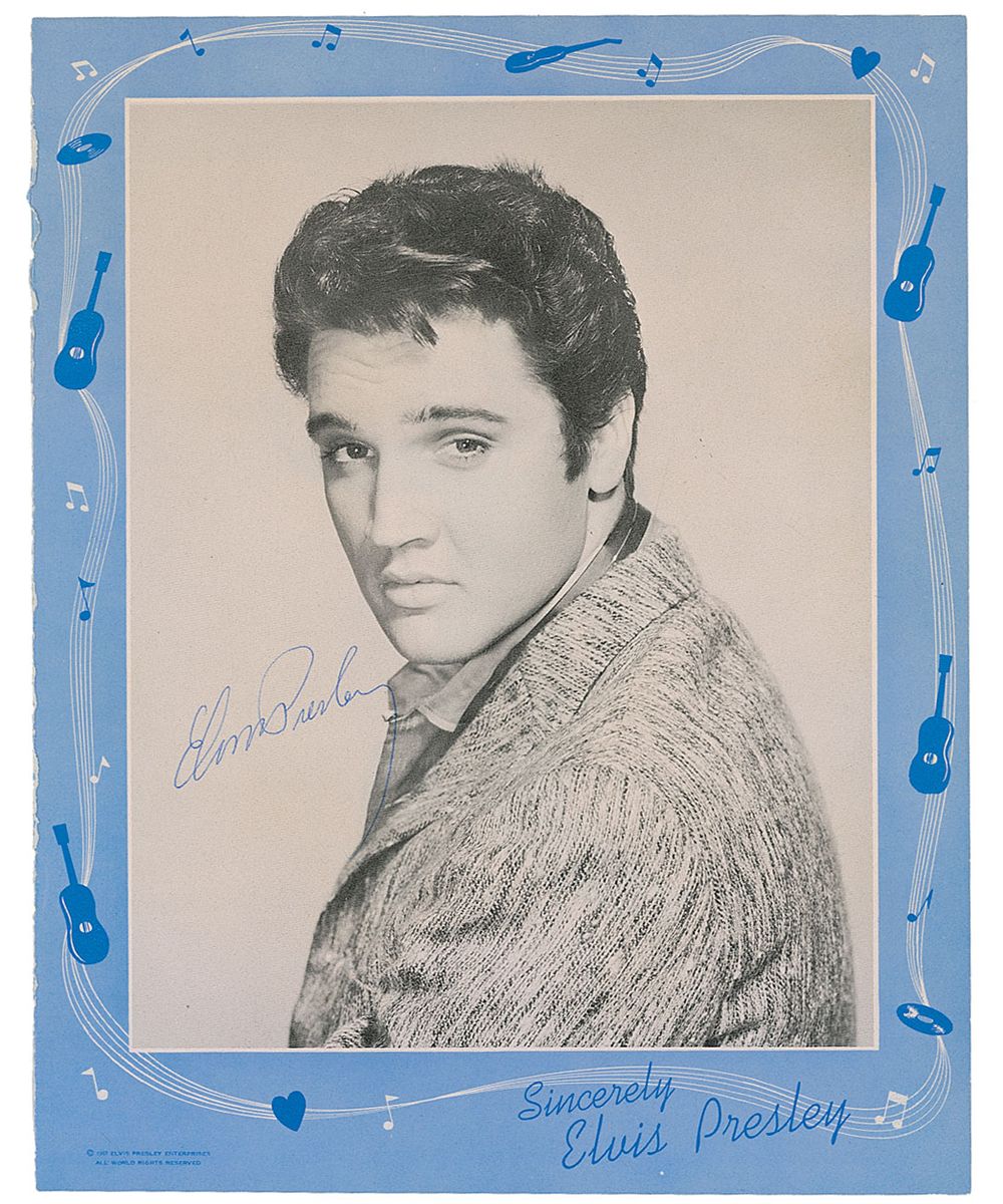 Vintage 8 x 10 program photo from 1957 of Elvis turning his head toward the camera, beautifully signed against the light background in blue ballpoint. In fine condition. Accompanied by a copy of a letter of provenance from the widow of Jerry Ledford, Elvis’s Second Lieutenant while at Fort Hood, stating that her husband was in the Army and assigned to basic training at Fort Hood at the same time Elvis was there, and that he occasionally helped to ‘smuggle’ Elvis off of the base in an effort to evade fans and paparazzi; near the end of his training, Elvis signed pages of a souvenir photo booklet for them. A fabulous image of ‘the King’ from the late 1950s.