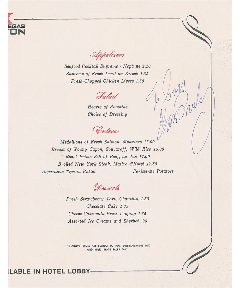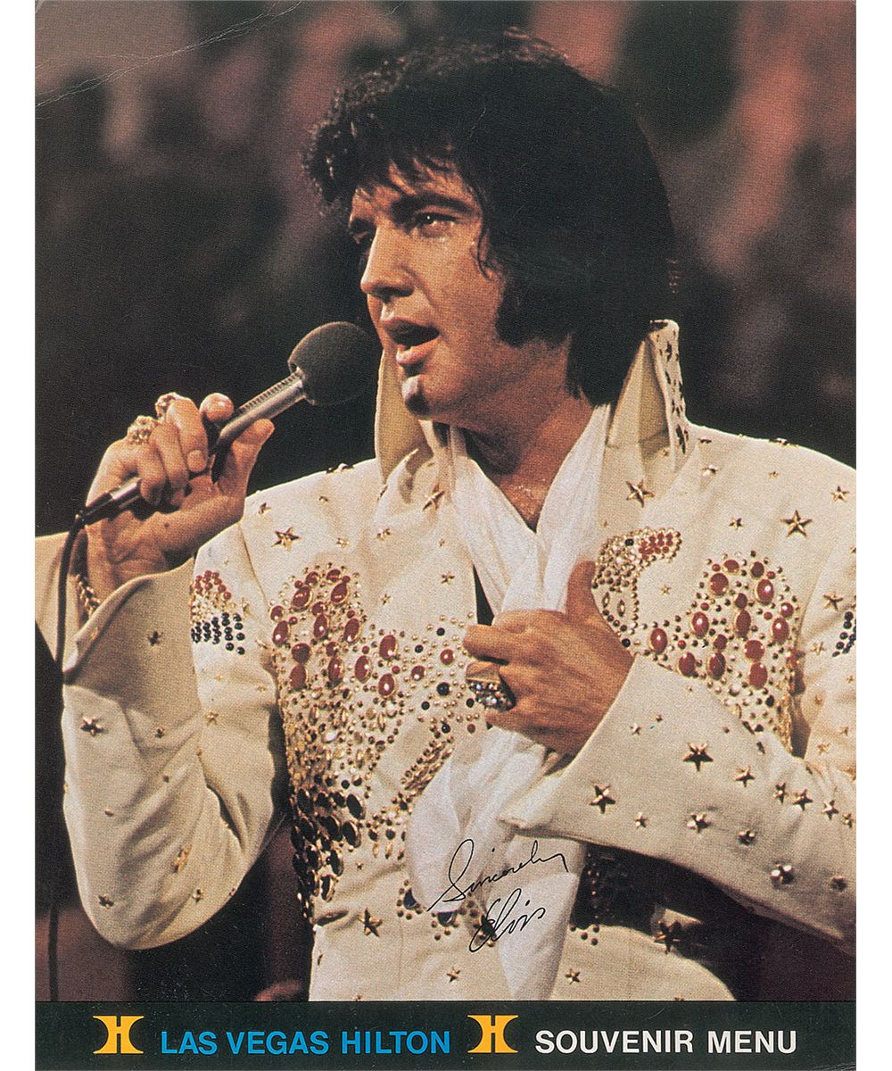 Official color souvenir menu from Presley’s engagement at the Las Vegas Hilton, 8.5 x 11, featuring a color image of Elvis on the front, and his sold-out locations from 1970–1974 on the back cover, signed and inscribed inside in blue ballpoint, “To Sam, Elvis Presley.” In fine condition, with a light crease to top left corner of front cover.