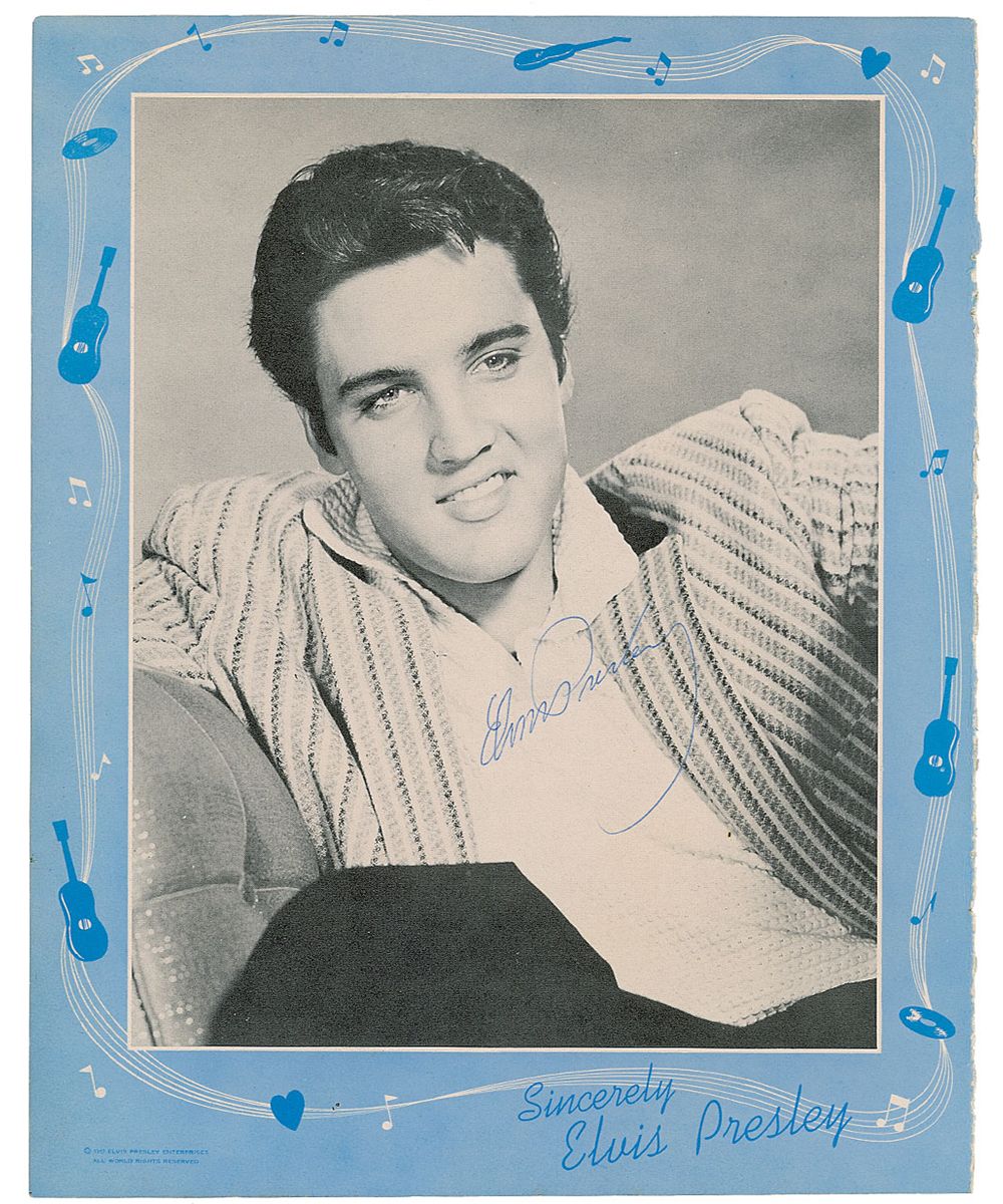 Handsome vintage image of Presley posing casually in a striped jacket, surrounded by a border of guitars, musical notes, and hearts, on the inside of an 8 x 10 cover of Presley’s 1957 Photo Folio, signed in blue ballpoint. Reverse (which is the front cover) bears an additional red fountain pen "Elvis Presley" done in an unknown hand. In fine condition. Accompanied by a copy of a letter of provenance from the widow of Jerry Ledford, Elvis’s Second Lieutenant while at Fort Hood, stating that her husband was in the Army and assigned to basic training at Fort Hood at the same time Elvis was there, and that he occasionally helped to ‘smuggle’ Elvis off of the base in an effort to evade fans and paparazzi; near the end of his training, Elvis signed pages of a souvenir photo booklet for them. Issued in 1957, the folio was used to promote Presley’s upcoming film Jailhouse Rock. A superlative portrait of the young rock and roll icon.