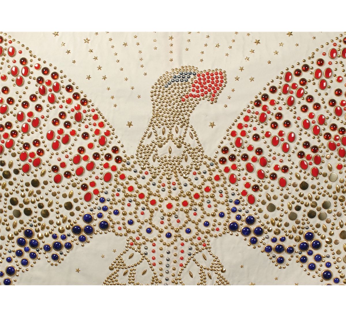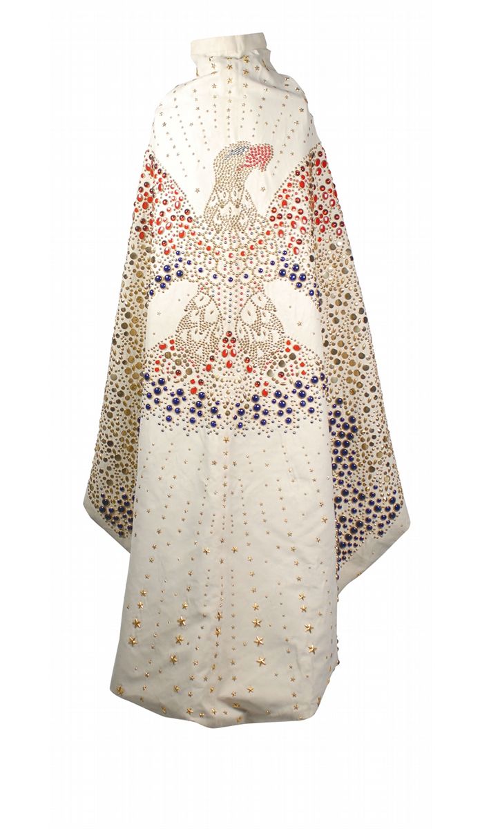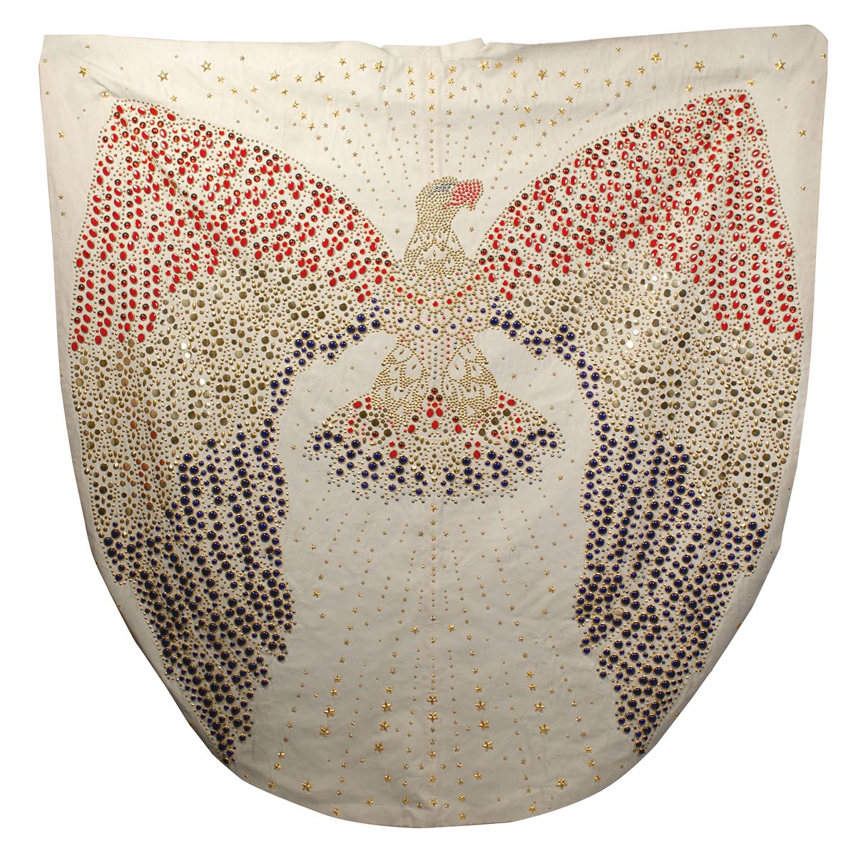 One-of-a-kind full-length American Eagle concert cape created for Presley’s 1973 Aloha from Hawaii satellite performance. The cape, designed by Bill Belew, measures almost five feet long, is heavily inlaid with semi-precious stones on the reverse in a grand and colorful American eagle surrounded by stars, and weighs in at an impressive 12 pounds. Three small hooks and Velcro are sewn into the collar to connect the cape to Presley’s jumpsuit, and two small straps are sewn into the corners to enable Elvis to stretch out the cape while wearing it. Accompanied by a certificate of authenticity from Greg Howell, the Exhibition and Collections Manager of Elvis Presley Enterprises at Graceland. In fine condition, with some expected light soiling and a few small separations to lining.