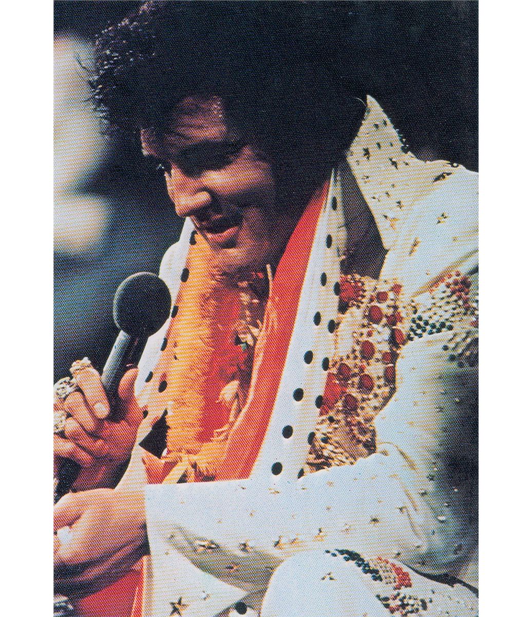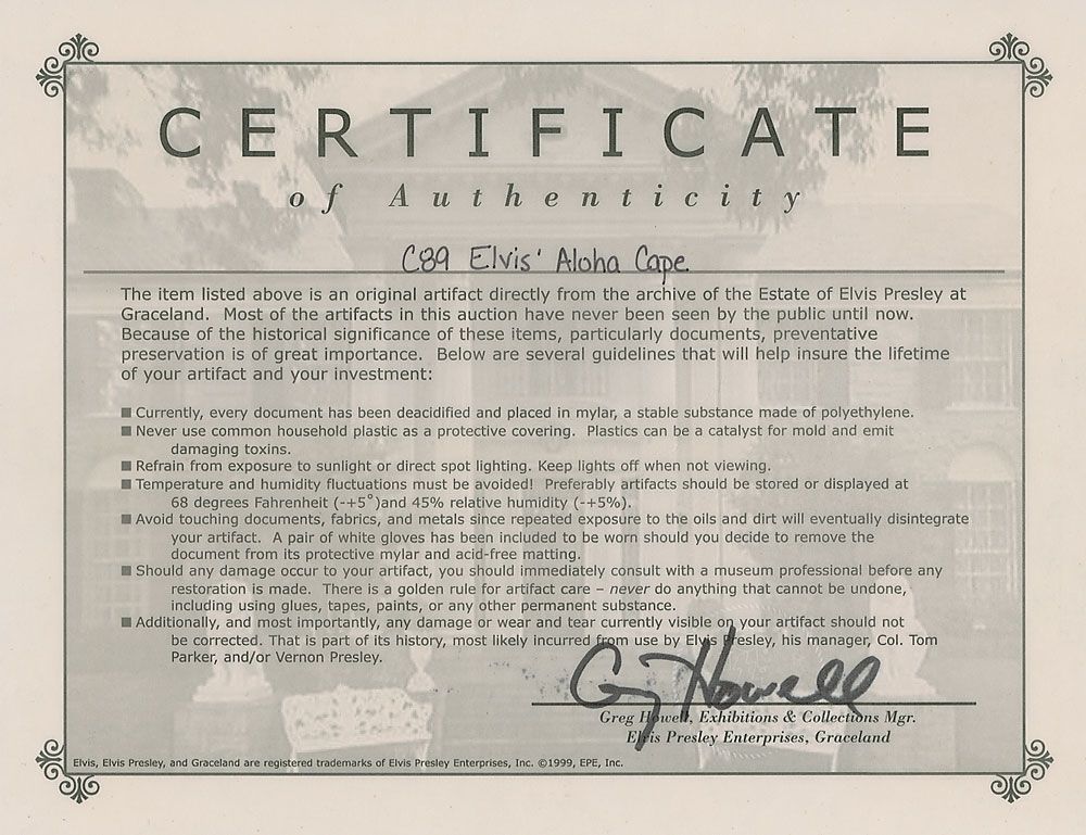 Presley had wanted a full-length cape to hide behind at the opening of the show, intending to drop the cape and reveal himself to the anxiously awaiting crowd. He worked closely with Belew on the design of the eagle, wanting to express his patriotism for his country. However, when Presley tried on the cape during rehearsals, the weight almost pulled him over backwards, and it was decided that a smaller version was needed. Belew had less than 24 hours to create the replacement, and this cape was sent back to Graceland where it remained until a charity auction in 1999. One of the ultimate Presley collectibles, this was the original design for one of his most significant live performances ever.