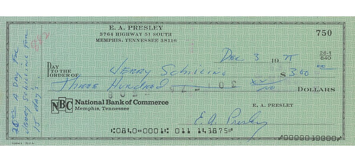 Personal check, 8.25 x 3, filled out in another hand and signed by Presley, “E. A. Presley,” payable to Jerry Schilling for $300.00, December 3, 1975. Notation in another hand to left edge reads, “20.00 a day for Jerry Schilling for 15 days.” Three vertical folds, stamp to center, and a small red pencil notation to top left, otherwise fine condition. Schilling met Presley when he was only 12 years old at a pick-up football game. Several years later, Presley hired him as a bodyguard while on the road. A nice Elvis item with great association to one of his trusted friends.