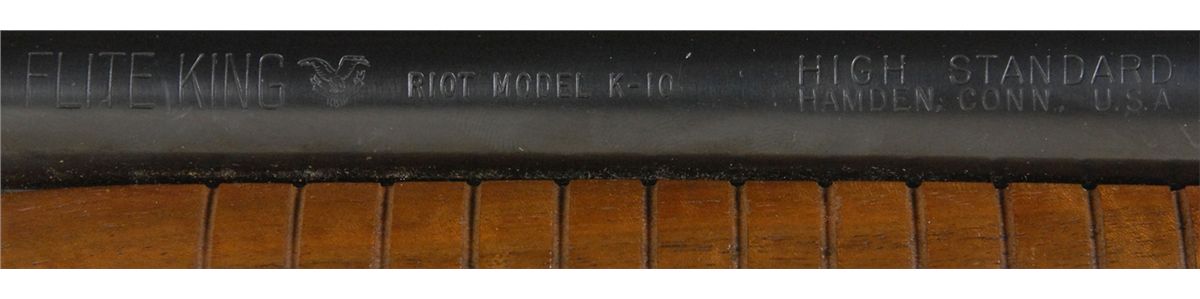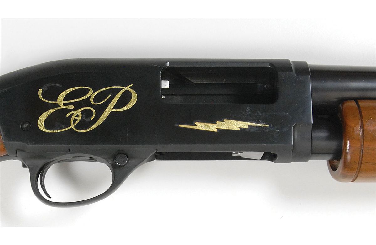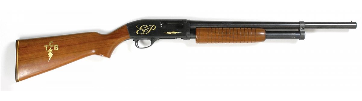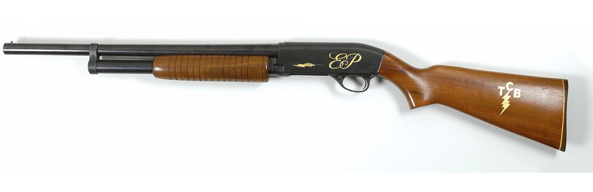 Elvis Presley’s personally-owned Flite King Riot Model K-10, 12 ga., no serial number (manufactured before 1968), 20? barrel, fine bore. Pump-action shotgun features a pistol grip and front bead sight. Gun has been customized by Presley with his initials and lightning bolts on both sides of the receiver, and his TCB—Taking Care of Business—monogram and lightning bolts on both sides of the stock. In fine condition, with some light surface scratches to the stock and some light wear and chipping to portions of the gold appliques. Accompanied by a certificate of authenticity from Jimmy Velvet of the Elvis Presley Museum, which reads, in full: “Elvis Presley personalized TCB shotgun. Flite King riot model K-10 high standard shotgun, with initials ‘EP’ on either side of the shotgun. This was the personal property of Elvis Presley.”