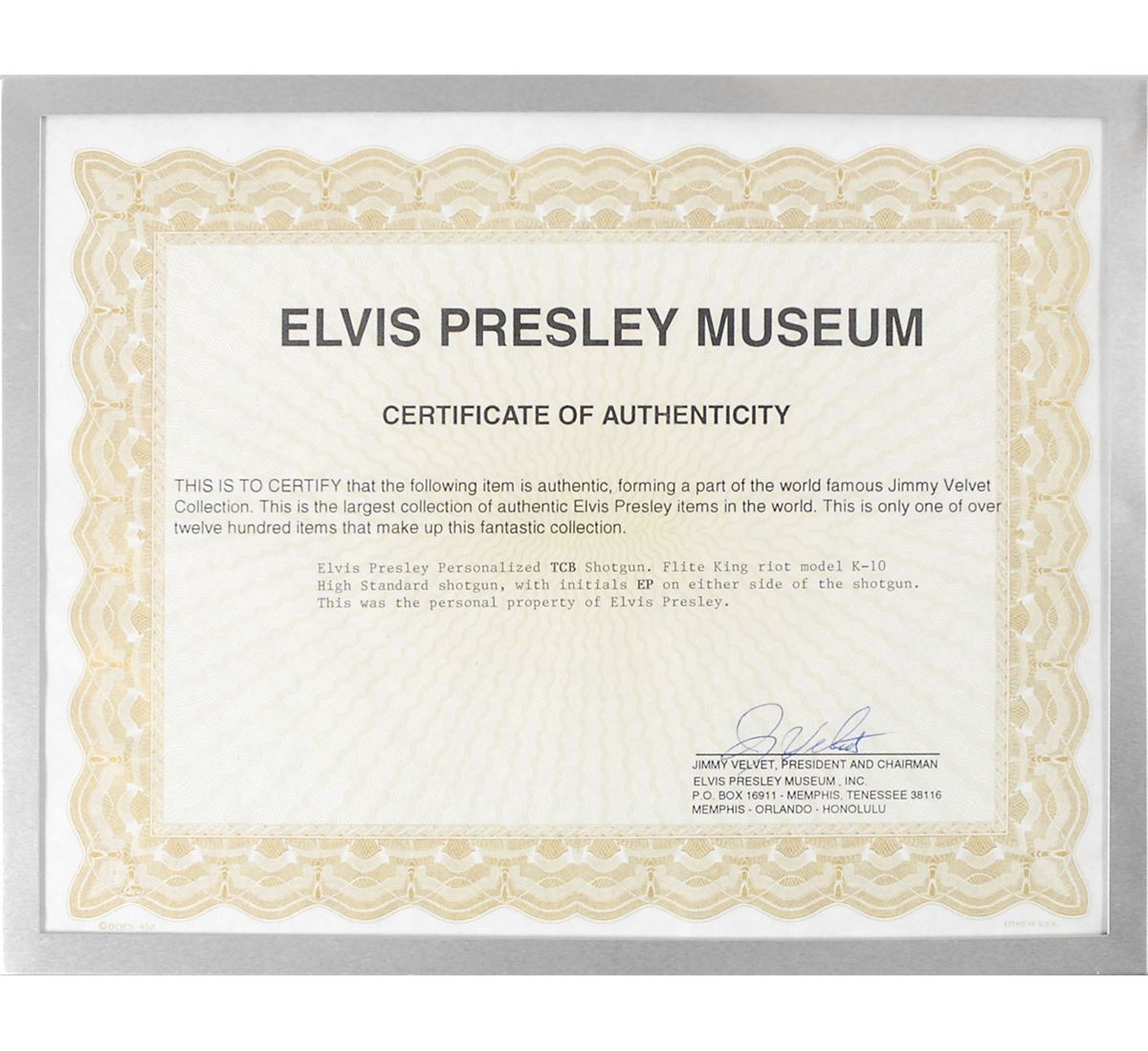 An avid gun collector, Presley amassed many firearms by the time of his death in 1977. He shared this affinity with his friends, gifting a Walther PPK to Hawaii Five-O’s Jack Lord, and famously presenting President Richard Nixon a nickel-plated Colt .45 in exchange for a badge from the Bureau of Narcotics and Dangerous Drugs. Although an enthusiast, the ‘King’s’ careless handling of firearms is also widely known, including an instance of shooting a television when Robert Goulet appeared on screen. This shotgun is particularly attractive, as it incorporates the name of Presley’s band and motto ‘Taking Care of Business,’ with the same logo used on Presley’s jewelry and touring plane. Presley’s firearms are seldom offered for sale at auction, and when they are, they routinely outsell almost all other Presley-owned or -used memorabilia. This transfers as a modern firearm.