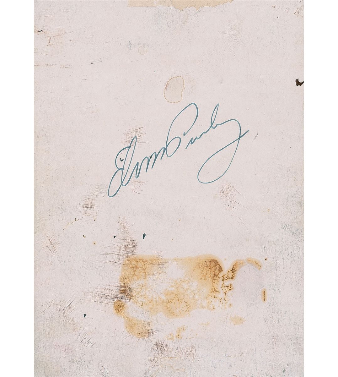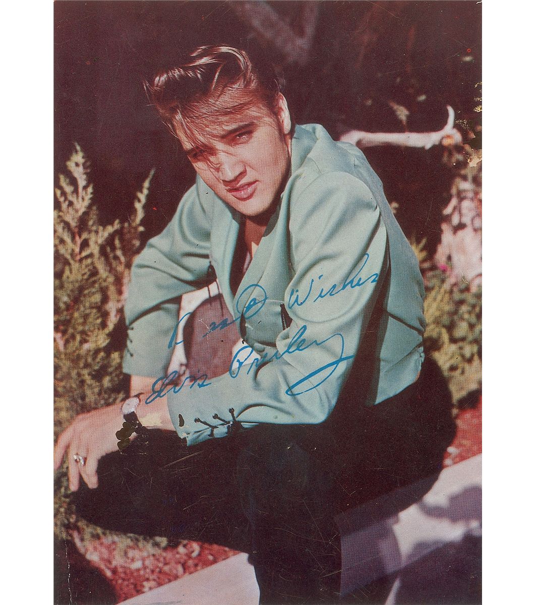 Color vintage 5 x 7 cardstock photo of Presley posing outdoors in a blue jacket, and bearing a pre-printed signature and sentiment, signed on the reverse in fountain pen. In very good to fine condition, with scattered soiling, adhesive remnants, and dampstaining to reverse, and some scattered creases and surface marks to image. Signature was originally obtained at the De Mille gate of Paramount Studios on June 9, 1960.
