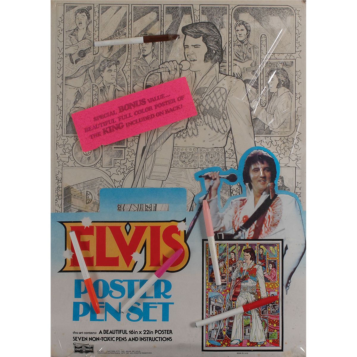 Original Elvis souvenir poster and pen set from 1977. Mostly still-sealed set features a 16 x 22 composite poster for coloring, has six of its original markers, and the full-color poster is also enclosed. In fine condition, with a few tears to packaging, as well as a few creases and spots of foxing.