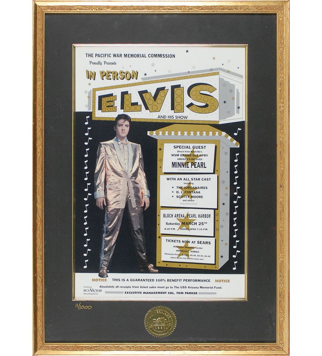 Color limited edition 10.5 x 15.25 modern print of the poster for Elvis’s fundraising show for the USS Arizona Memorial fund sponsored by the Pacific War Memorial Commission, numbered 11/1000, produced by Graceland in April 1991. Beautifully matted and framed to an overall size of 15.75 x 21.75. In fine condition.