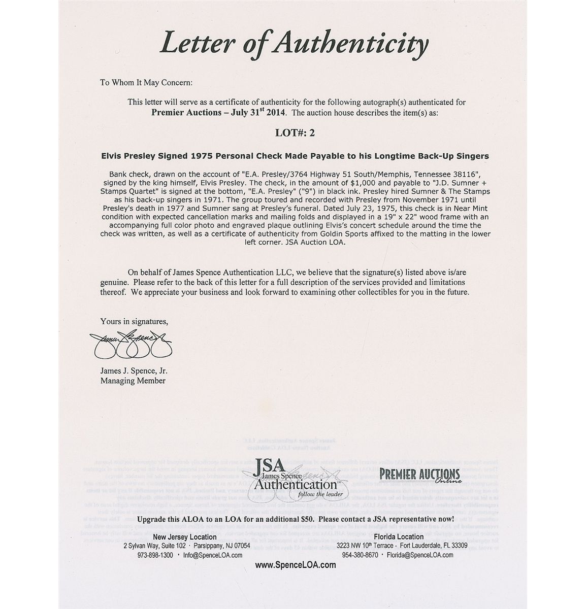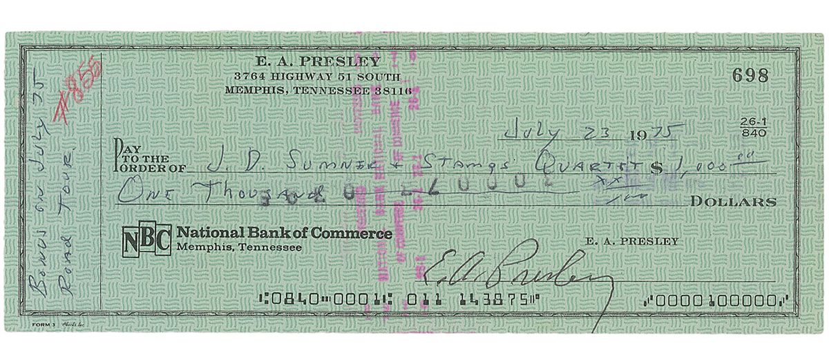 Personal check, 8.25 x 3, filled out in another hand and signed by Presley, “E. A. Presley,” payable to J. D. Sumner & Stamps Quartet for $1000, July 23, 1975. The memo field notes that this payment was as a “Bonus on July 75 Road Tour.” In fine condition, with expected cancellation stamps and notations. Accompanied by a mat display for the check also featuring a photo and engraved plaque. This date marked the second night of three performances in Ashville, North Carolina, the penultimate show of his summer tour. Although Presley’s behavior was increasingly erratic, these three shows were regarded as some of his best. The Stamps were a group led by bass gospel singer J. D. Sumner, who Presley had idolized as a teenager after seeing him perform with the Sunshine Boys. Beginning in 1971, Elvis hired Sumner’s Stamps Quartet as his back-up singers, and toured and recorded with them until his death in 1977. A terrific musical association.