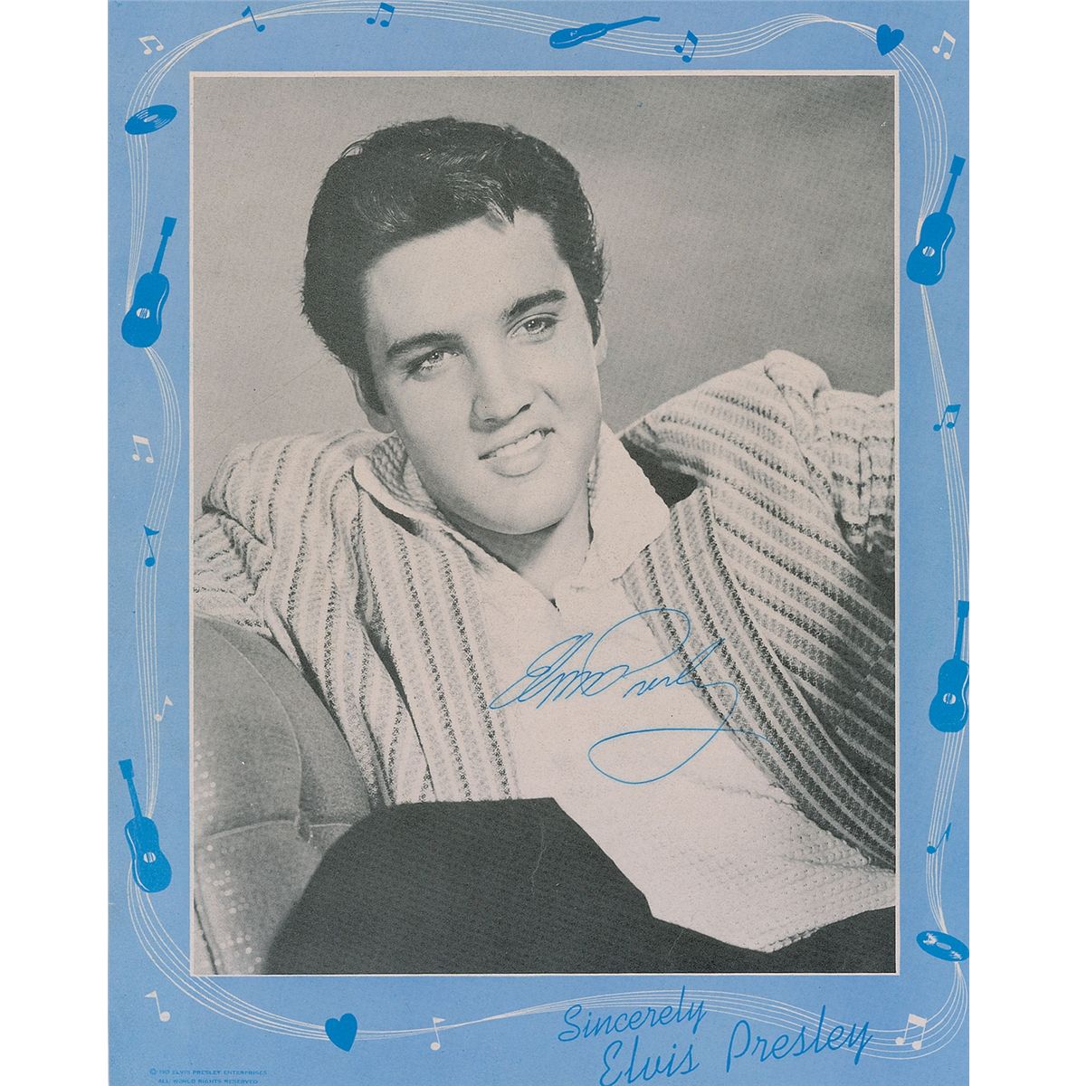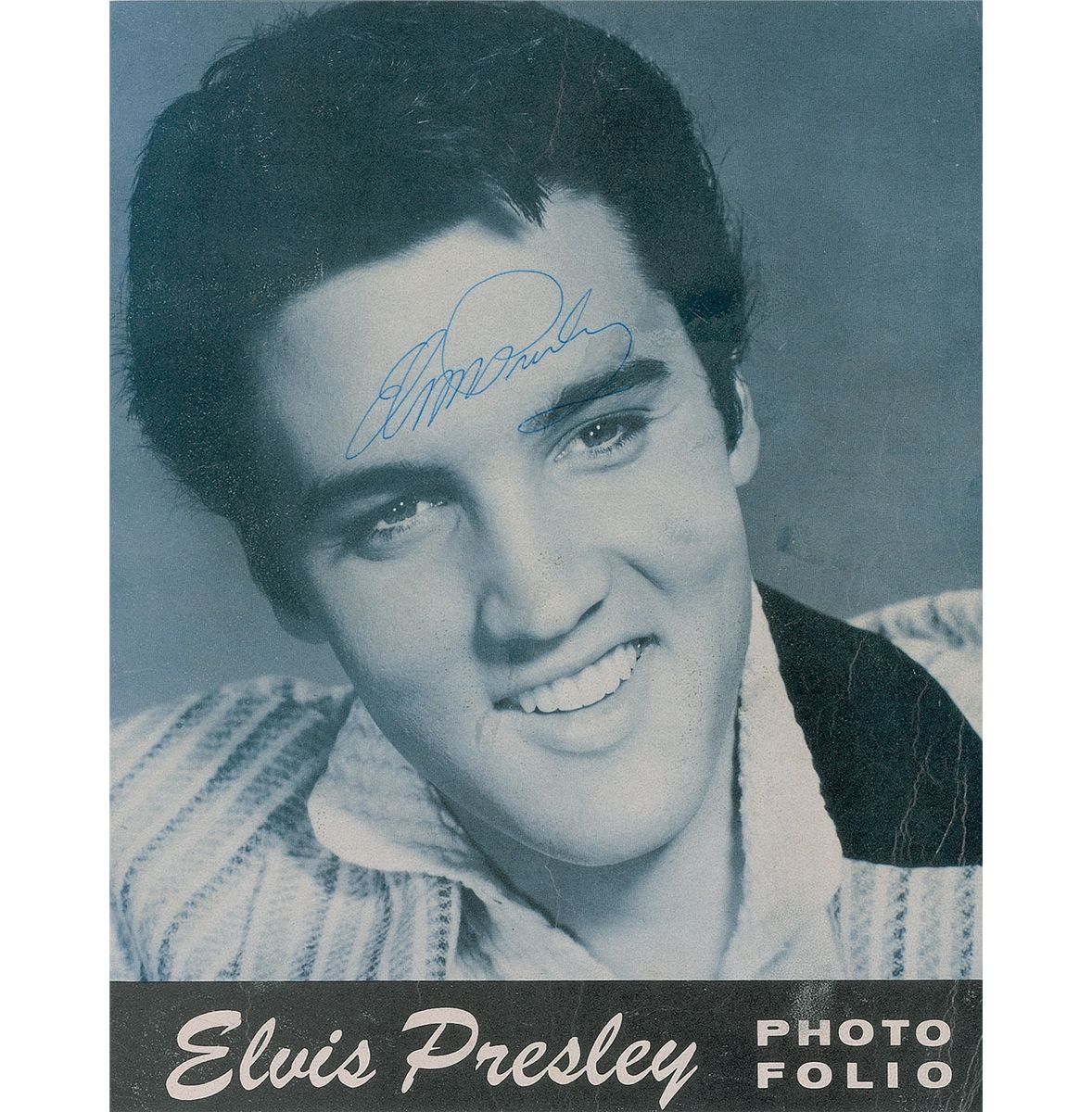 Exceptional vintage 7.75 x 9.75 double-sided program cover from the 1957 Elvis Presley photo folio, signed on both sides in blue ballpoint. Smoothed overall creases and some mild staining to the forehead and nose areas on one side, otherwise fine condition. A wonderful uninscribed example with a pair of bold signatures.