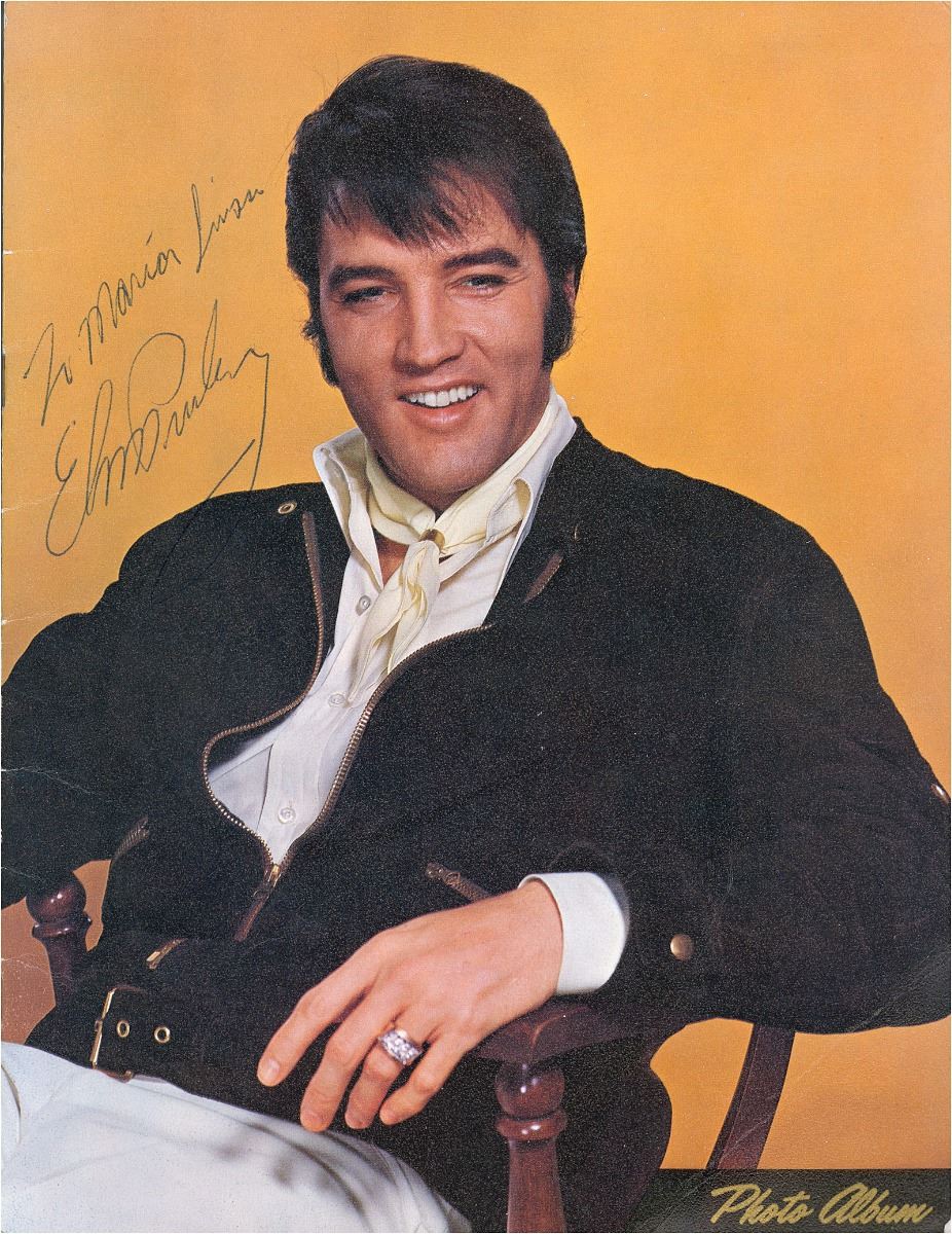 RCA Records Photo Album program of Elvis Presley, 8.5 x 11, 16 pages, featuring a variety of iconic images of the King performing, signed and inscribed in blue ballpoint on the front cover, “To Maria Davies, Elvis Presley.” In fine condition, with slight wear and creasing to edges, and a diagonal crease to lower right corner. Accompanied by a 1970 promo for an appearance by Elvis at Las Vegas’ International Hotel, the location where Davies, a branch leader for a British Elvis fan club, obtained the signature.
