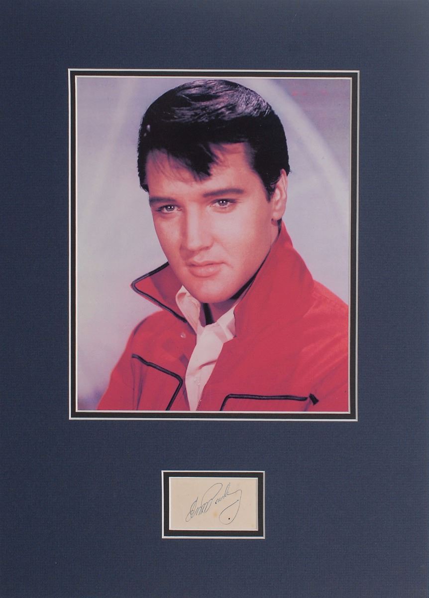 Vintage ballpoint signature, “Elvis Presley,” on an off-white slip. Double-matted with a color glossy photo of Presley to an overall size of 12.25 x 17.25. Some light foxing, otherwise fine condition.