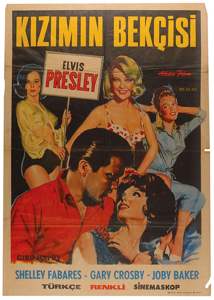 Eight items: an original Turkish color 27.5 x 39 one-sheet movie poster for the 1965 film Kizimin Bekcisi (Girl Happy), starring Elvis Presley and Shelley Fabares; and a set of seven exhibitor’s campaign books, merchandise heralds, and press books for the films Tickle Me (1965), Spinout (1966), Live a Little, Love a Little (1968), That’s the Way It Is (1970), The Trouble with Girls (1969), Harum Scarum (1965), and Stay Away, Joe (1968). In overall very good to fine condition.