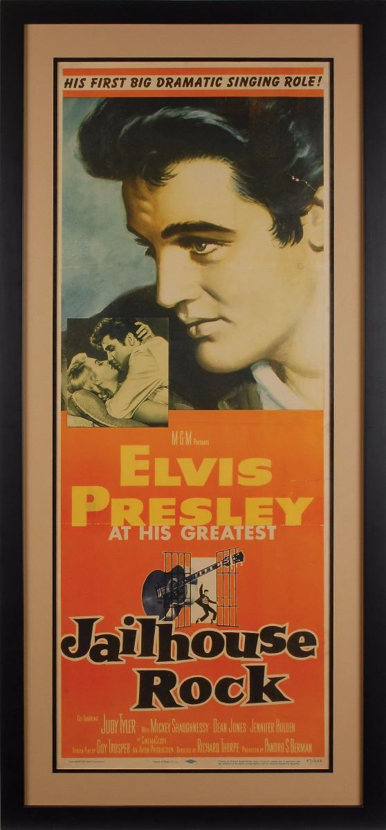 Original color insert movie poster for the 1957 MGM film Jailhouse Rock, 14 x 36, starring Elvis Presley in what was billed as “his first big dramatic singing role!” The poster has been professionally de-acidified, and archivally double-matted and framed under non-glare glass to an overall size of 19 x 41. In very good to fine condition, with three horizontal folds, several tears to the edges, and a small stain near Elvis’s ear.