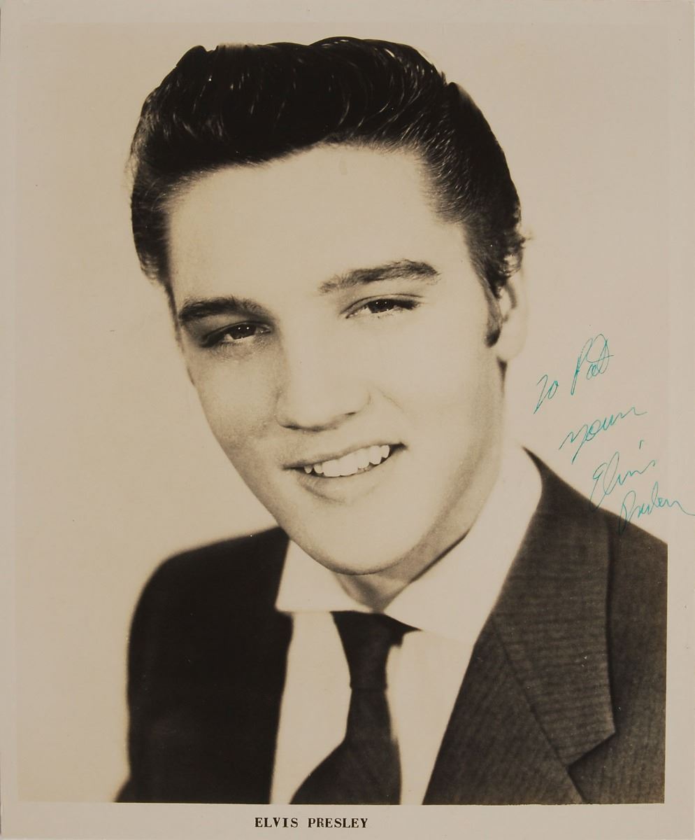 Uncommon vintage glossy 8 x 9.75 publicity portrait of Elvis in a suit and tie with his classic pompadour haircut, signed and inscribed in green ballpoint, “To Pat, yours, Elvis Presley.” Mounted to a same-size piece of heavy cardstock and in very good condition, with scattered light overall creasing.