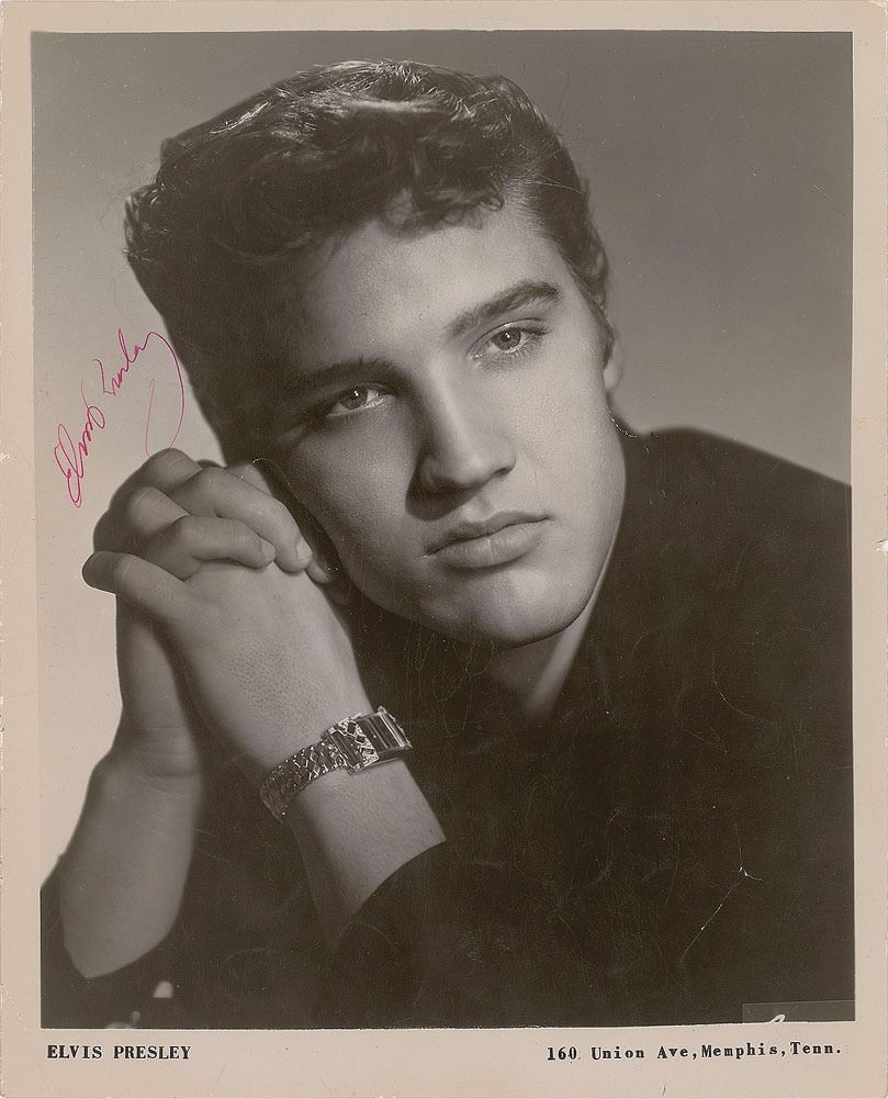 Immensely desirable vintage circa 1955 glossy 8 x 10 publicity photo of Presley, who has signed on the front in red fountain pen and on the reverse in pencil. The reverse has also been signed and inscribed in pencil and ink by several of his band members: "To Thelma, Jimmy Newman," "Lots of luck, Rufus Thibodeaux," "Scotty Moore," "Jimmy Day," "Bill Black," and "Floyd Cramer." In very good condition, with scattered creasing, and surface impressions on the front from the signatures on the reverse. Elvis was active with Black and Moore as the Blue Moon Boys from 1954 to 1957, a period that jump-started the career of the future 'King of Rock and Roll.'