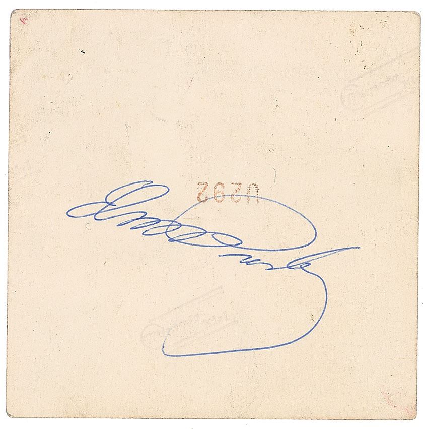 Rare vintage glossy 3.5 x 3.5 candid photo of Presley standing in US Army uniform, signed neatly on the reverse in blue ballpoint. In very good to fine condition, with scattered light creasing. Accompanied by a full letter of authenticity from REAL.