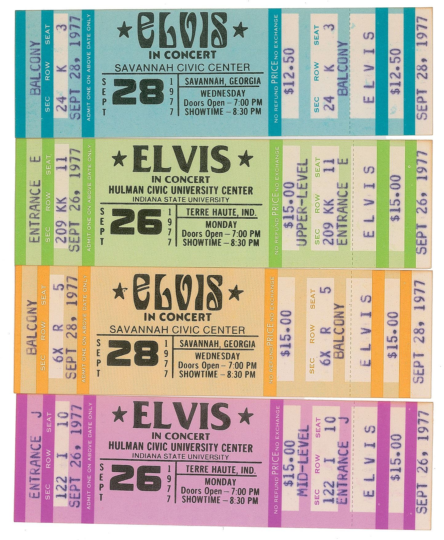 Group of four unused tickets to Elvis concerts, with venues and dates including: two different types of tickets for the show at the Human Civic University Center at Indiana State University on September 26, 1977; and two different types of tickets for the show at the Savannah Civic Center on September 28, 1977. In overall fine condition.