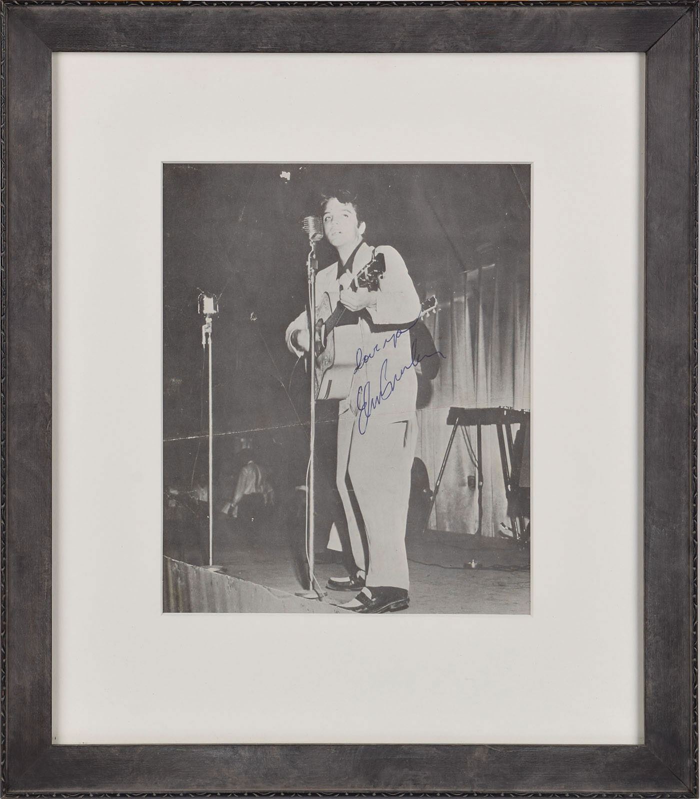 Vintage 7.25 x 8.75 program photo of Presley in a fantastic full-length pose from early in his career, portraying 'The King' singing and playing the guitar while on stage, signed crisply over his suit in blue ballpoint, "Love you, Elvis Presley." Matted and framed to an overall size of 13.75 x 15.5. In very good to fine condition, with scattered light creasing, and a diagonal crease across the image.