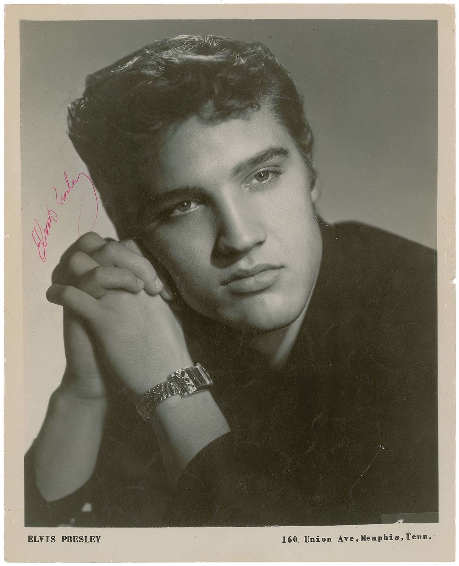 Immensely desirable vintage circa 1955 glossy 8 x 10 publicity photo of Presley, who has signed on the front in red fountain pen and on the reverse in pencil. The reverse has also been signed and inscribed in pencil and ink by several of his band members: "To Thelma, Jimmy Newman," "Lots of luck, Rufus Thibodeaux," "Scotty Moore," "Jimmy Day," "Bill Black," and "Floyd Cramer." In very good condition, with overall creasing, and impressions to the front from the signatures on the reverse. Elvis was active with Black and Moore as the Blue Moon Boys from 1954 to 1957, a period that jump-started the career of the future 'King of Rock and Roll.'