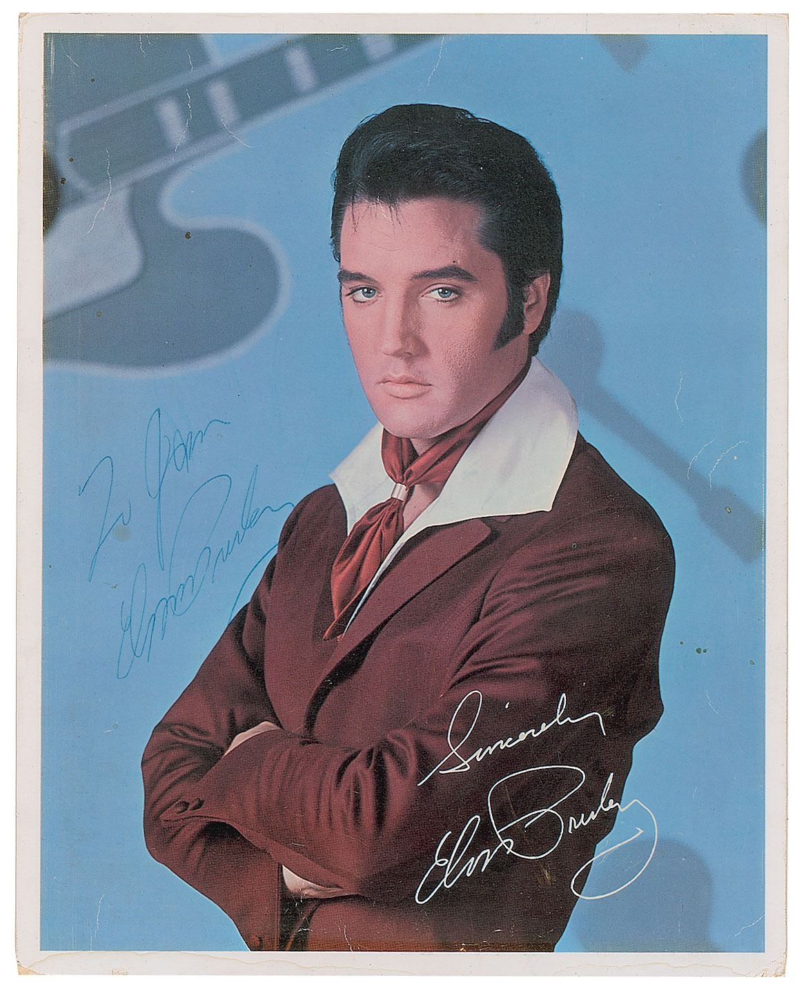 Excellent color 8 x 10 RCA publicity photo of Presley with his arms folded against a blue guitar backdrop, signed and inscribed in blue ballpoint, "To Jan, Elvis Presley.” Reverse bears a catalog of RCA recordings by Presley. In very good to fine condition, with scattered light creasing to the background.