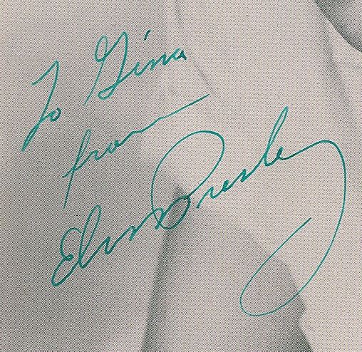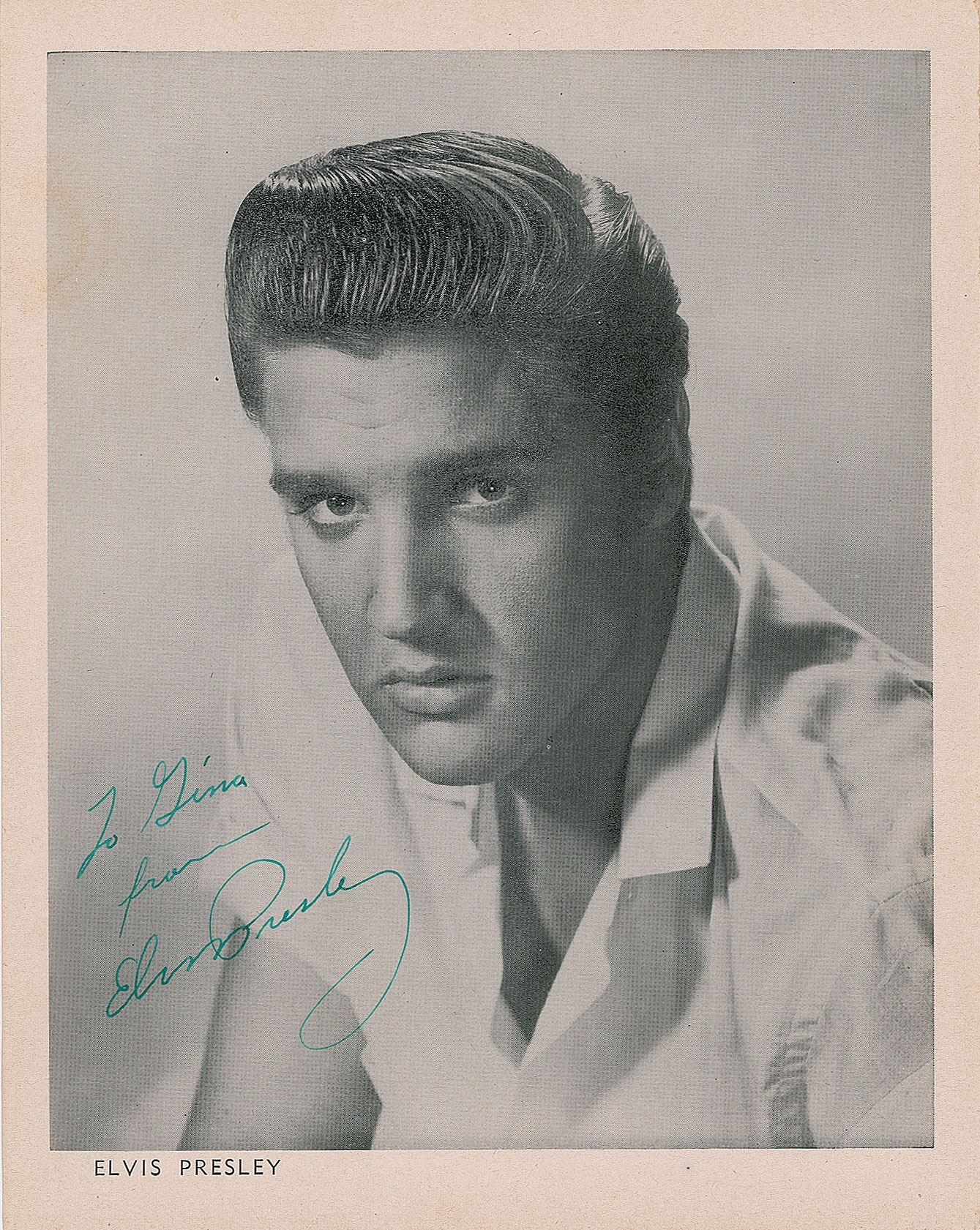 Incredible vintage 8 x 10 paperstock photo of Presley with slicked hair and a light collared shirt, signed and inscribed in green fountain pen, "To Gina, from, Elvis Presley.” In fine condition, with a faint stain to the upper left edge.
