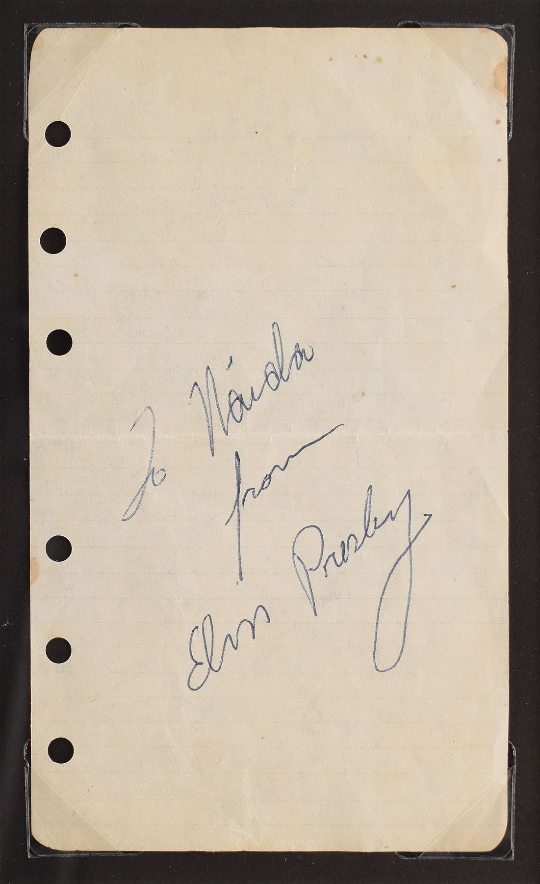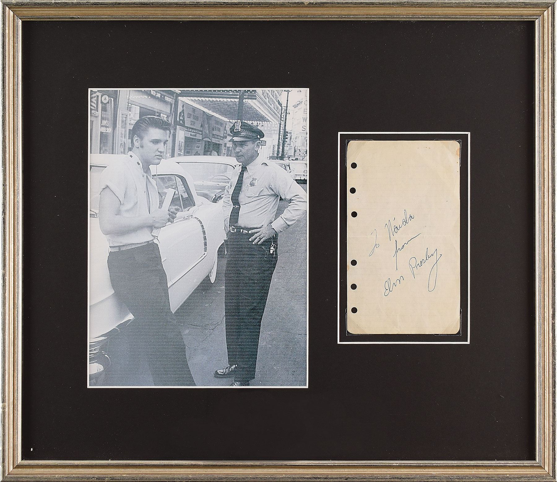 Vintage ballpoint signature and inscription, "To Naida, from, Elvis Presley,” on an off-white 3.5 x 6 notebook page. Matted and framed with an image of Presley and a police officer to an overall size of 17.25 x 15. In very good condition, with overall creasing and a central horizontal fold. Accompanied by a full letter of authenticity from REAL and by a letter of provenance from the son of the original recipient: "I came across this Elvis autograph and remembered my dad having told me how he had gotten an Elvis autograph for my mother. My dad was a Memphis police officer, and during one of his shifts, he was working in South Memphis and met Elvis Presley. Elvis was a big law enforcement fan and would always offer autographs to any of the officers he met. Since my mother was a big fan of Elvis, my dad took a piece of paper from his notepad and had Elvis sign an autograph that was made out to my mother."