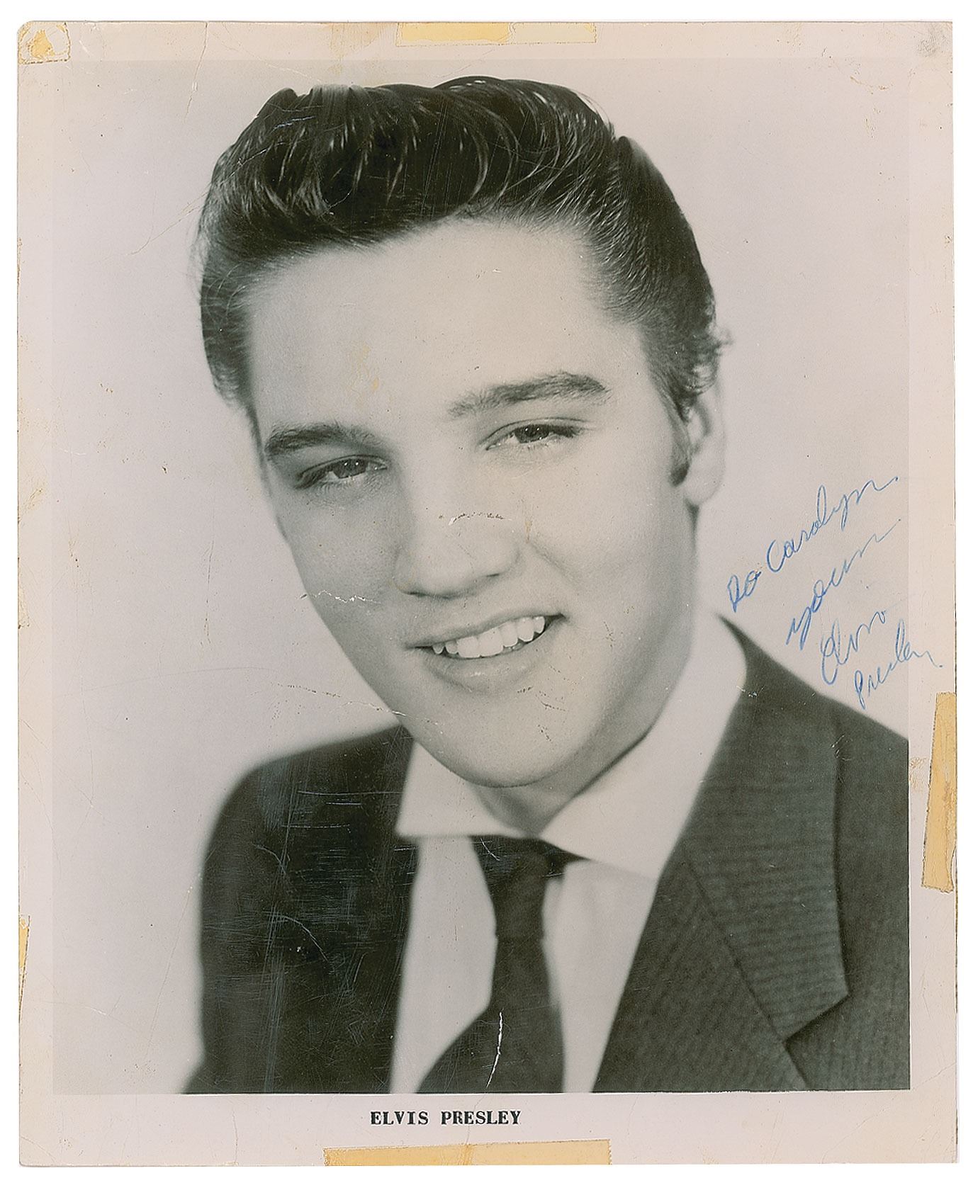 Classic vintage glossy 8 x 10 promo photo of Elvis Presley in a suit and tie, signed and inscribed in blue ballpoint, "To Carolyn, yours, Elvis Presley." In very good condition, with two edge tears, old tape in the borders, and some scratches and heavy creasing affecting appearance.