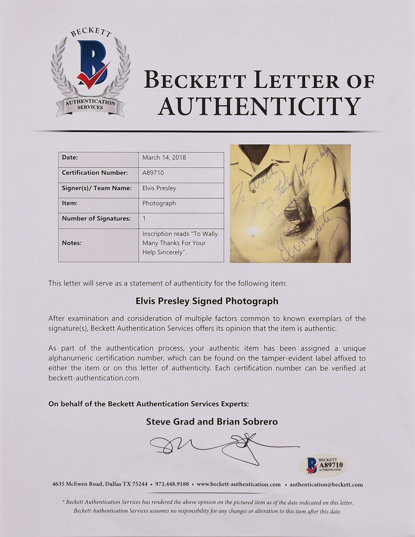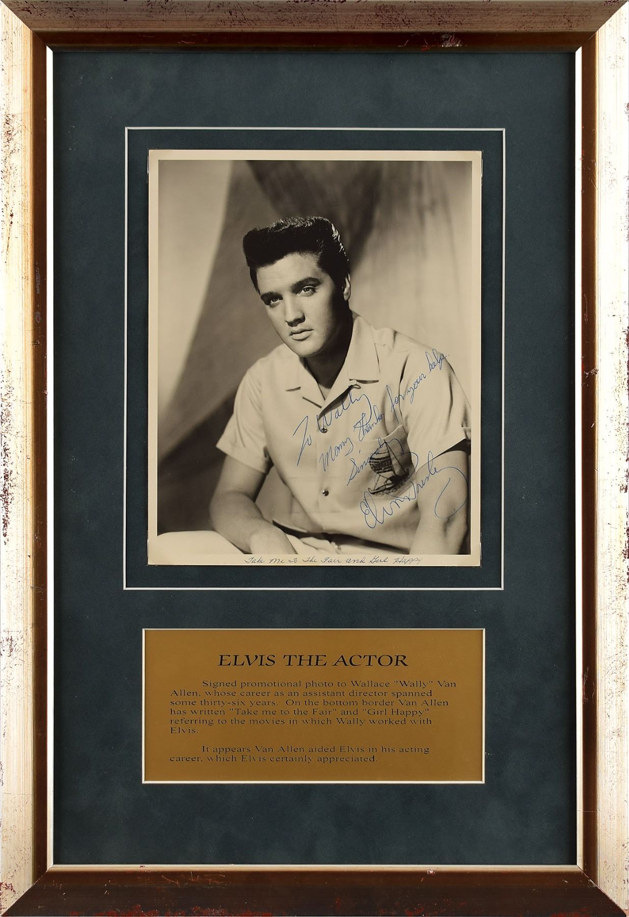 Superb vintage matte-finish 8 x 10 photo of Presley in a handsome half-length pose, signed and inscribed in blue ballpoint, "To Wally, Many thanks for your help. Sincerely, Elvis Presley.” Lower border of photo annotated by the recipient, "Take Me to the Fair and Girl Happy." Mounted and suede-matted with a plaque detailing the provenance of the photo: "Signed promotional photo to Wallace 'Wally' Van Allen, whose career as an assistant director spanned some thirty-six years. On the bottom border Van Allen has written 'Take Me to the Fair' and 'Girl Happy,' referring to the movies in which Wally worked with Elvis. It appears Van Allen aided Elvis in his acting career, which Elvis certainly appreciated." Archivally framed to an overall size 15 x 22. In fine condition. Accompanied by a full letter of authenticity from Beckett Authentication Services.