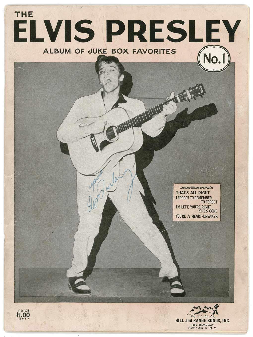 Original vintage Elvis Presley Album of Juke Box Favorites songbook, 9 x 12, 35 pages, printed in 1955. Songbook contains 15 songs and 13 images inside, and is signed on the front cover in blue ballpoint, “Yours, Elvis Presley.” In very good condition, with some scattered light soiling and creasing to the cover (including a long diagonal crease, not affecting the signature), and toning to several inside pages from taped-in newspaper clippings.