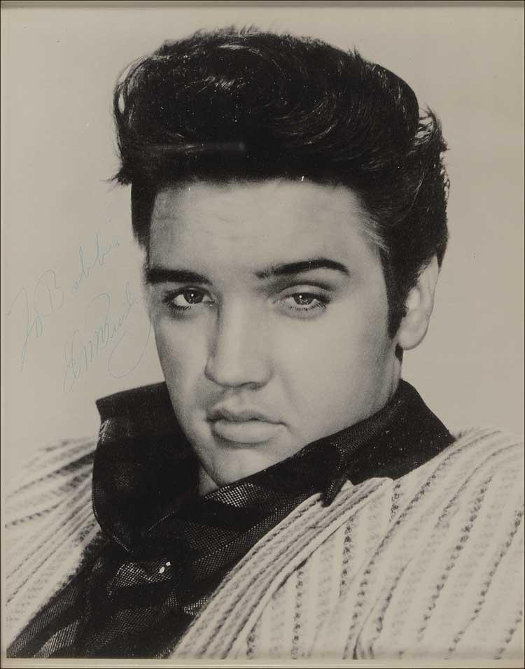 Handsome vintage glossy 7.25 x 9.5 head-and-shoulders photo of a young Elvis, signed and inscribed in blue ink “To Bobbie, Elvis Presley.” Suede matted and framed to an overall size of 20.25 x 22.25. In fine condition, with some mild rippling, a couple of trivial surface creases, and the ink a couple of shades light but entirely readable.