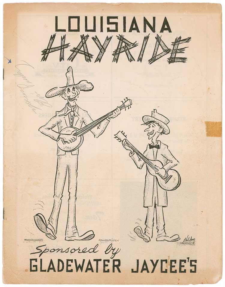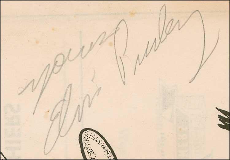 Original vintage program for the Louisiana Hayride, 8.5 x 11, eight pages, signed on the front cover in pencil, “Yours, Elvis Presley.” According to the line-up inside, Presley performed five songs throughout the day including “That’s Alright”, and “I Got a Woman”. Accompanied by a photo of Presley performing, presumably at the event. In very good condition, with light overall toning, a bit heavier to edges of covers, light overall wrinkling and handling wear, paper loss to a couple of inside pages, paper loss to back cover, and old tape remnants. Pre-certified Roger Epperson/REAL and RRAuction COA.