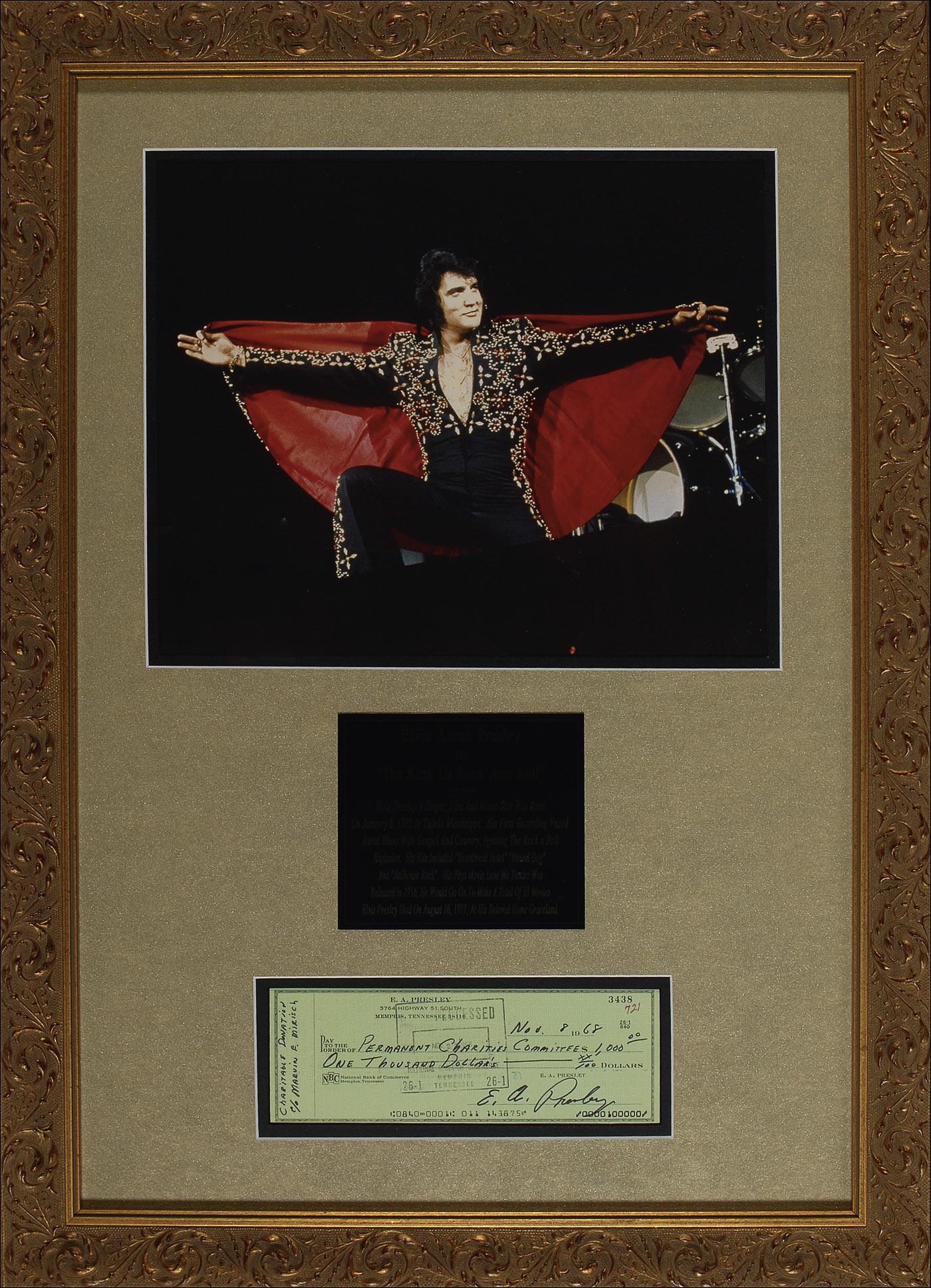 Personal check, 8 x 3, filled out in another hand and signed by Presley, “E. A. Presley,” payable to Permanent Charities Committees for $1,000.00, November 8, 1968. Notation in another hand in left border reads, “Charitable donation c/o Marvin E. Mirisch.” Double matted and framed with a color portrait of Presley on stage and a biographical plaque, to an overall size of 19.25 x 27. Elvis was well-known for donating to local charities in his area around the holidays. In fine condition, with bank stamp to center, approaching, but not affecting signature, ink notation to top right, and slight show-through from stamp on reverse. Oversized. Pre-certified Roger Epperson/REAL and RRAuction COA.