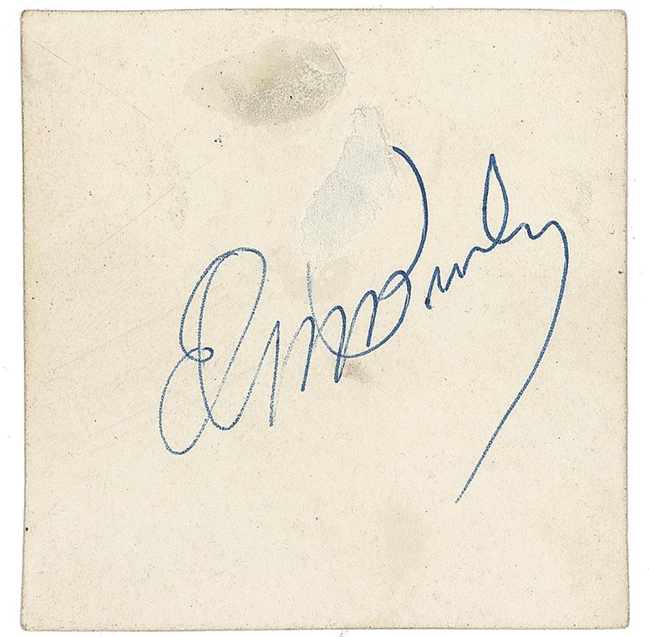 Vintage glossy 2.25 x 2.25 candid photo of Elvis smiling nicely outdoors in his military uniform, signed on the reverse in blue ballpoint. Small mounting remnant to top of reverse, and surface loss affecting a single stroke of last name, otherwise fine condition. Consignor notes signature was acquired by her aunt in Wiesbaden, Germany. Her uncle attended the same school as Priscilla, and they were able to take some candid photos of Elvis while attending an event in the summer of 1959. Pre-certified Roger Epperson/REAL and RRAuction COA.