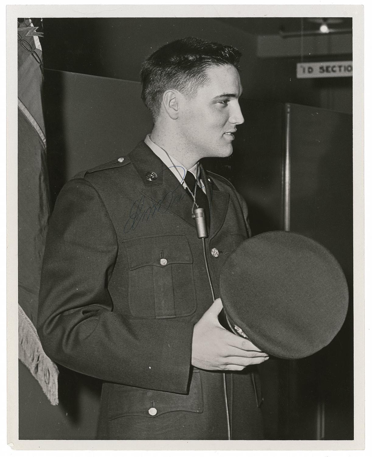 Vintage glossy 8 x 10 photo of Presley in his dress uniform at Fort Hood, Texas, signed in blue ballpoint, “Elvis Presley.” An impression of another Elvis signature under Presley’s ballpoint signature, scattered light creases and surface marks, a few dull spots to emulsion, and a bit of mild signature contrast, otherwise fine condition. Elvis went through basic training at Fort Hood from March 28 to September 19, 1954.
