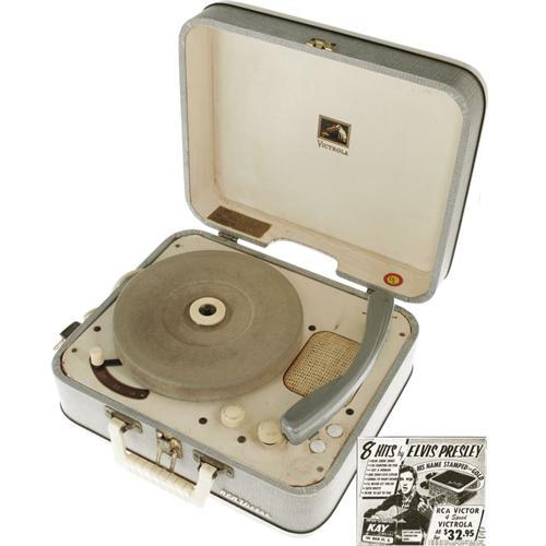 <B>Elvis Vintage RCA Victor Portable Record Player.</B></I> An RCA Victor 7-EP-2 Elvis Signature record player with a dark blue with a light blue tweed lid that has Elvis' signature embossed on it in gold lettering. The multi-speed player has settings for 16, 33, 45, and 78rpm recordings, and it <I>is</B></I> in working order. Overall it's in Very Fine condition with mild wear.<BR><BR><b>Shipping:</b> Musical Instruments, Small (<a target="_blank" href="http://www.heritageauctions.com/common/shipping.php">view shipping information</a>)