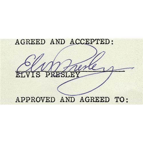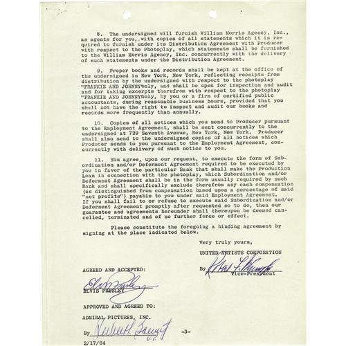 <B>Elvis Signed "Frankie and Johnny" Contract.</B></I> Four-page agreement, dated May 19, 1964, between Presley and Admiral Pictures Inc. concerning total payment after the distribution of the movie "Frankie and Johnny," signed by Presley in blue ink. In fine condition with binder and staple holes to the top edges. <I>With COA from PSA/DNA.</B></I>