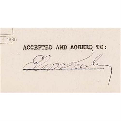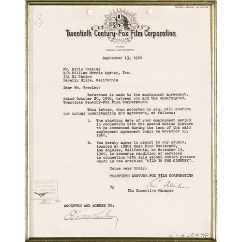 <B>Elvis Presley Signed "Wild in the Country" Contract.</B></I> A single-page agreement dated September 13, 1960, engaging Elvis as the star of the 1961 feature film <I>Wild in the Country,</B></I> signed by him in blue ink. In Excellent condition and matted along with a color 8" x 10" photo of Elvis to an overall size of 23" x 20".<I>Accompanied by LOA from PSA/DNA.</B></I><BR><BR><b>Shipping:</b> Large Flat (<a target="_blank" href="http://www.heritageauctions.com/common/shipping.php">view shipping information</a>)