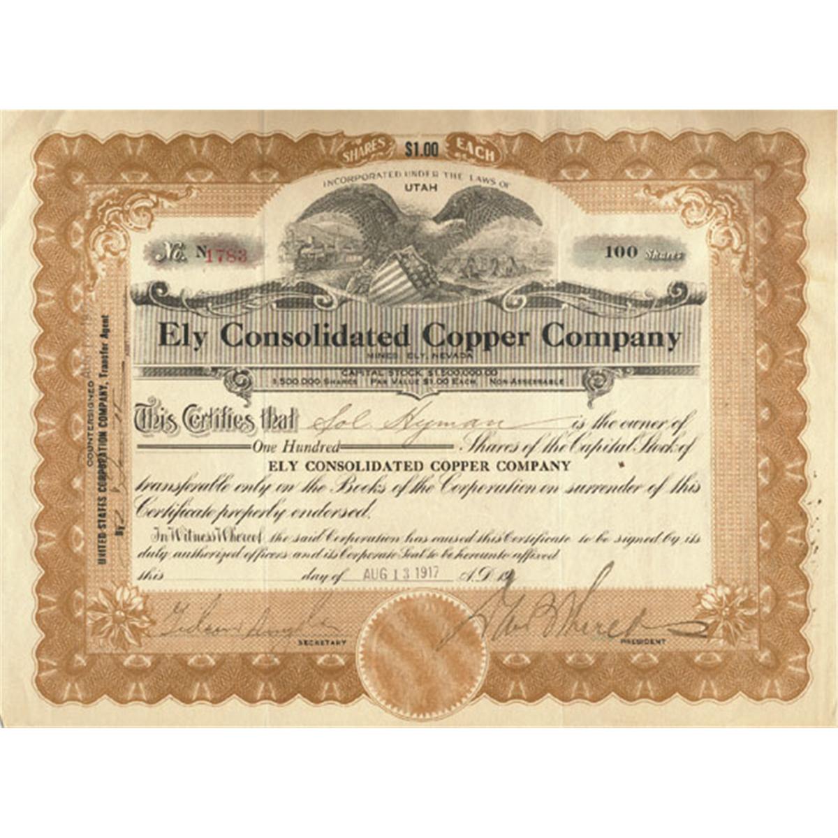 1917. Utah. Stock certificate for 100 shares. Brown/Black. Vignette of eagle at top center. Very fine.