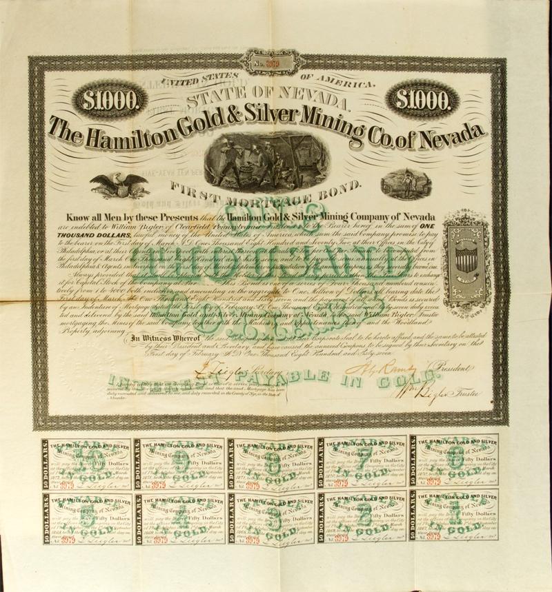 The company was incorporated in 1866. This is a first mortgage bond, #3979, held by William Bigler of Clearfield, Pennsylvania. William Bigler signed as a Trustee, along with Alex. Ramsy, president, and L. Tiegler, secretary. Vignette at center of miners with lighted helmets working in underground with picks and shovels. Two smaller vignette: one of an American bald eagle and the other of a farmer carrying a United States flag. Black border with green under printing on crème paper. Ten coupons are attached. Entire document measures 14.5 x 15.5.” There is a 3” lateral tear at left on the center fold. The town of Hamilton was developed in 1868 with the discovery of silver—so rich that the area attracted 10,000-25,000 people in a short time, and the “…silver was found in such quantities to pay most of the Civil War debt” [Ref: